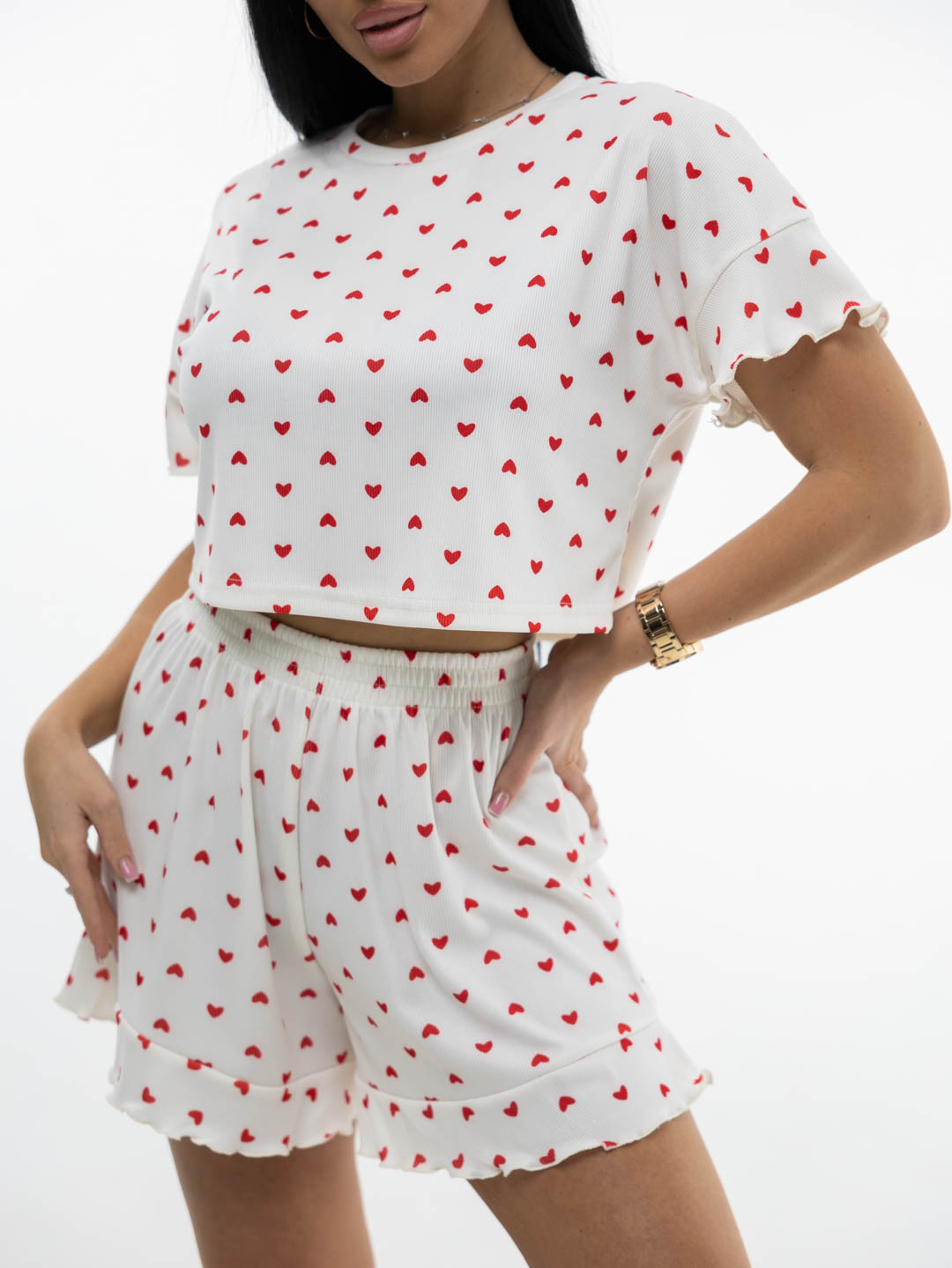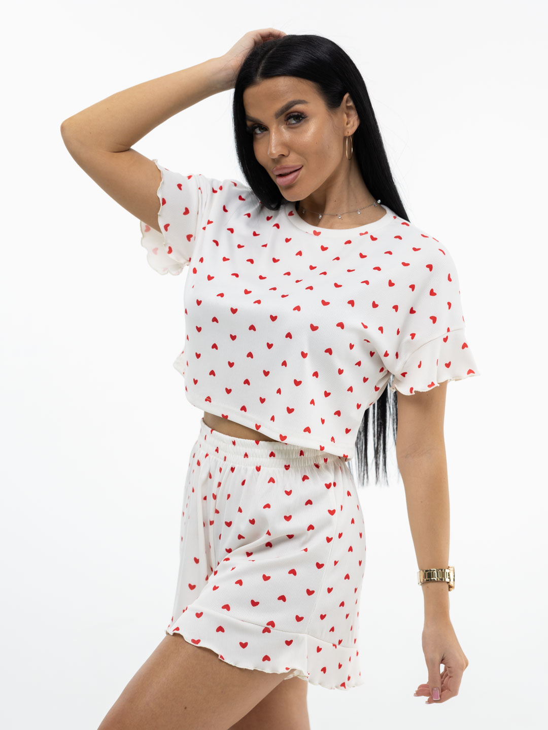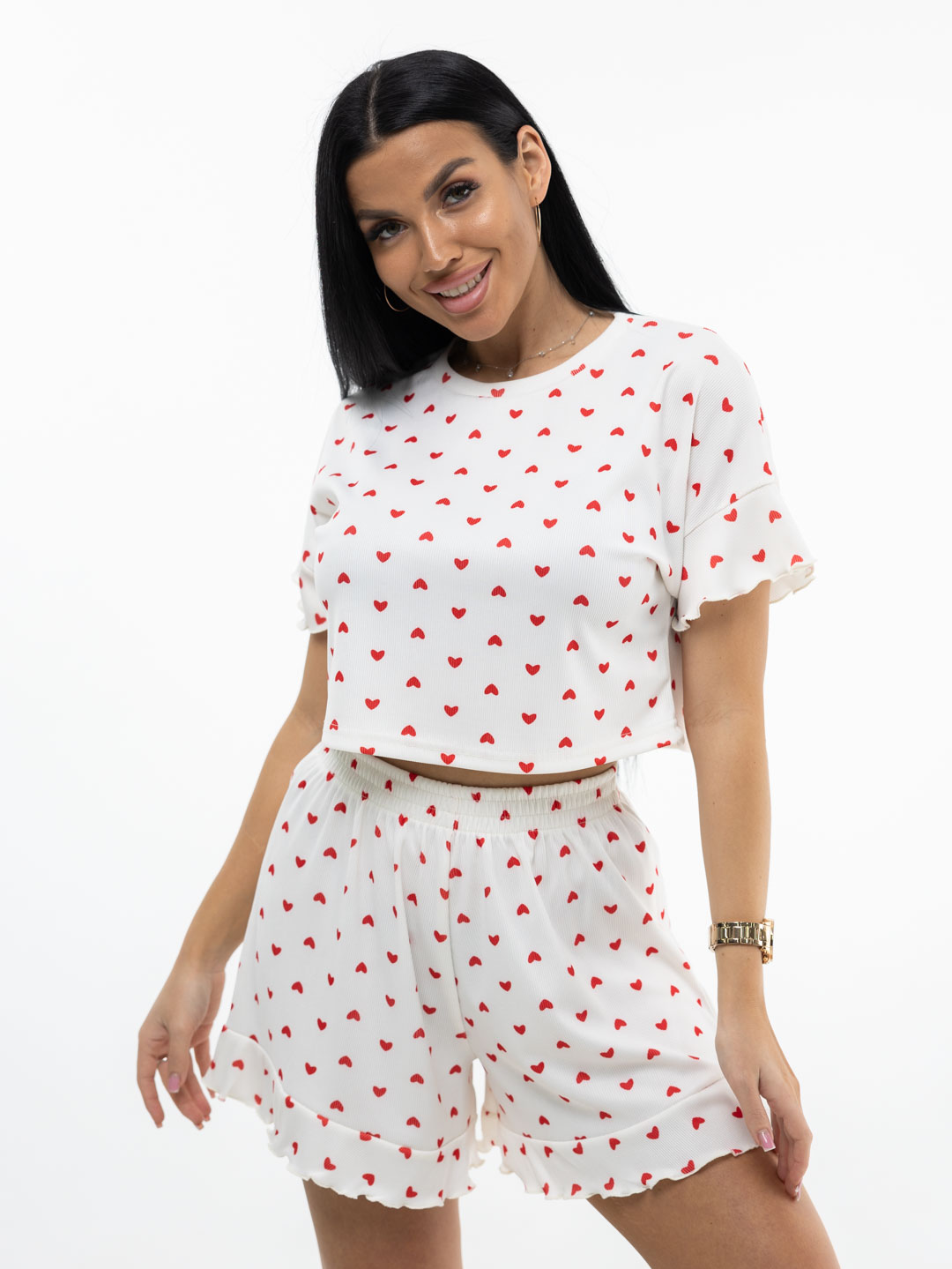 Молодежная пижама в ультрамодной расцетке "мелкое сердечко", материал очень легкий и приятный на ощупь, в рубчик. Топ с О-образной горловиной и коротким рукавом-воланом. Шорты на мягкой резинке с воланами по низу.