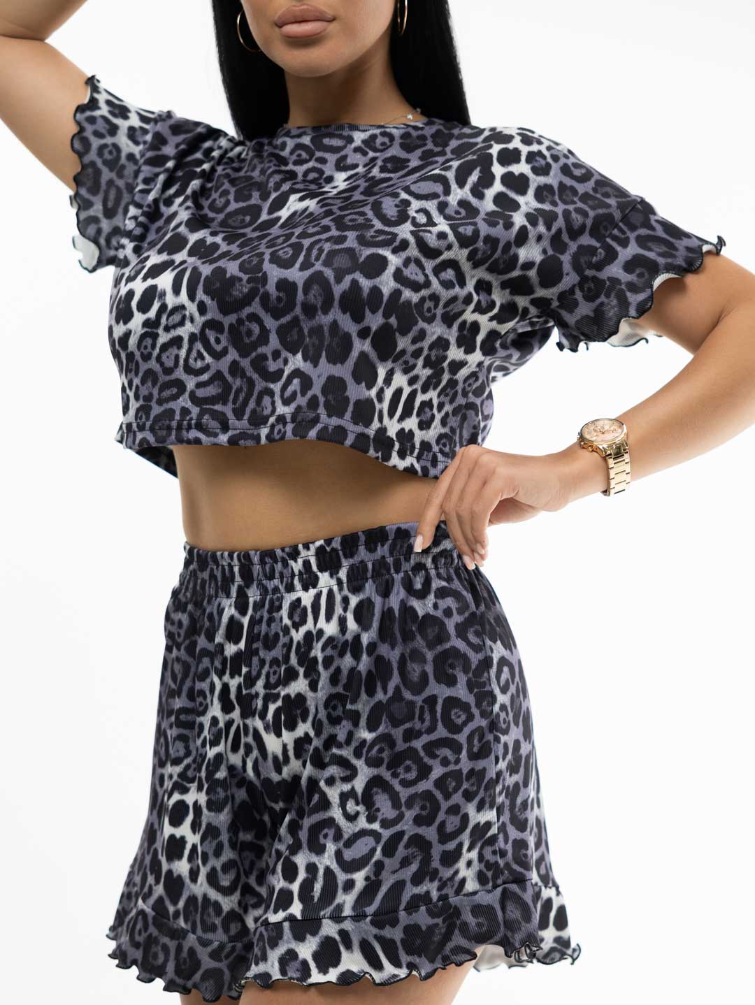 Молодежная пижама в ультрамодной расцветке, материал очень легкий и приятный на ощупь, в рубчик. Топ с О-образной горловиной и коротким рукавом-воланом. Шорты на мягкой резинке с воланами по низу.