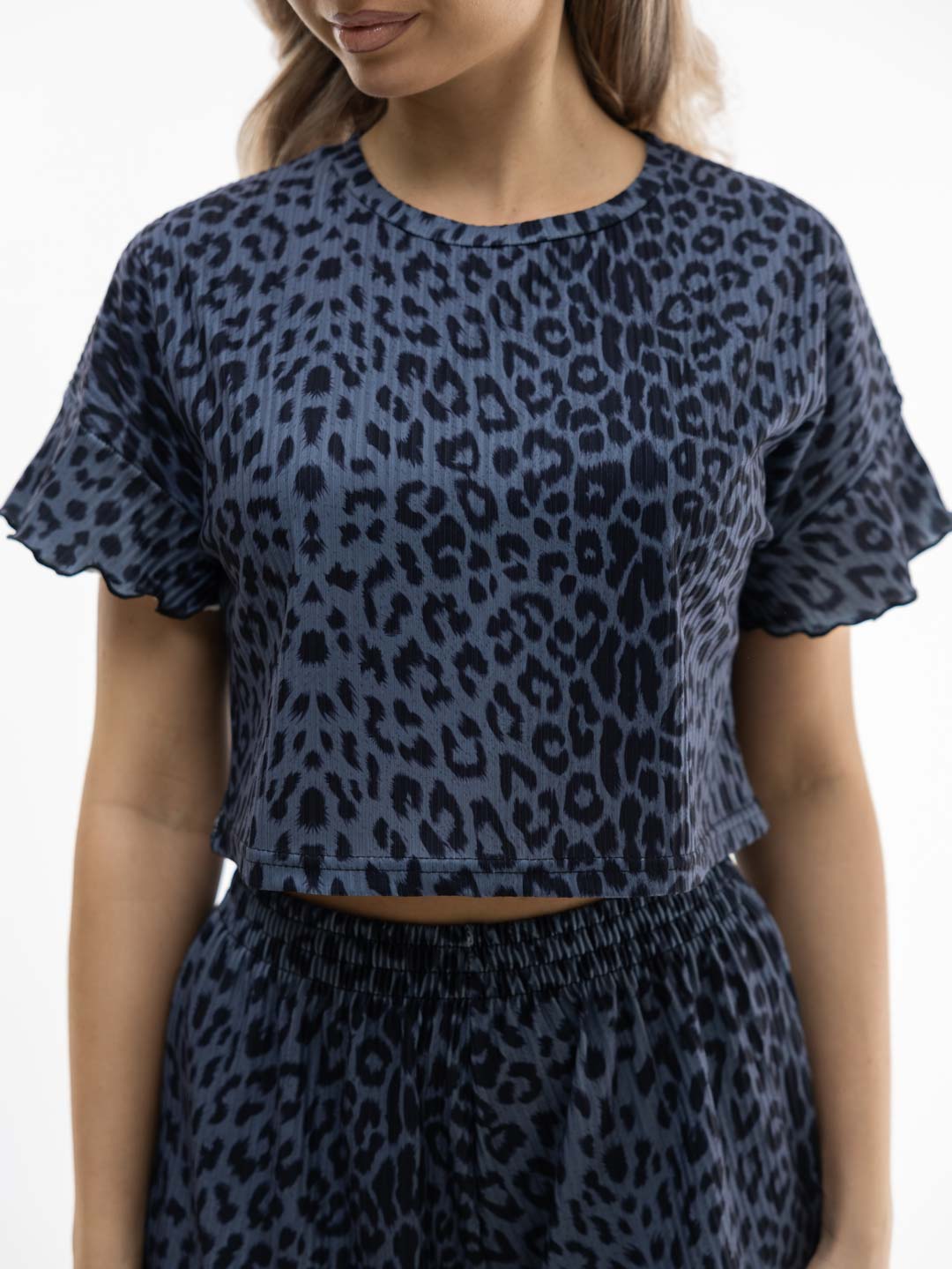 Молодежная пижама в ультрамодной расцветке, материал очень легкий и приятный на ощупь, в рубчик. Топ с О-образной горловиной и коротким рукавом-воланом. Шорты на мягкой резинке с воланами по низу.