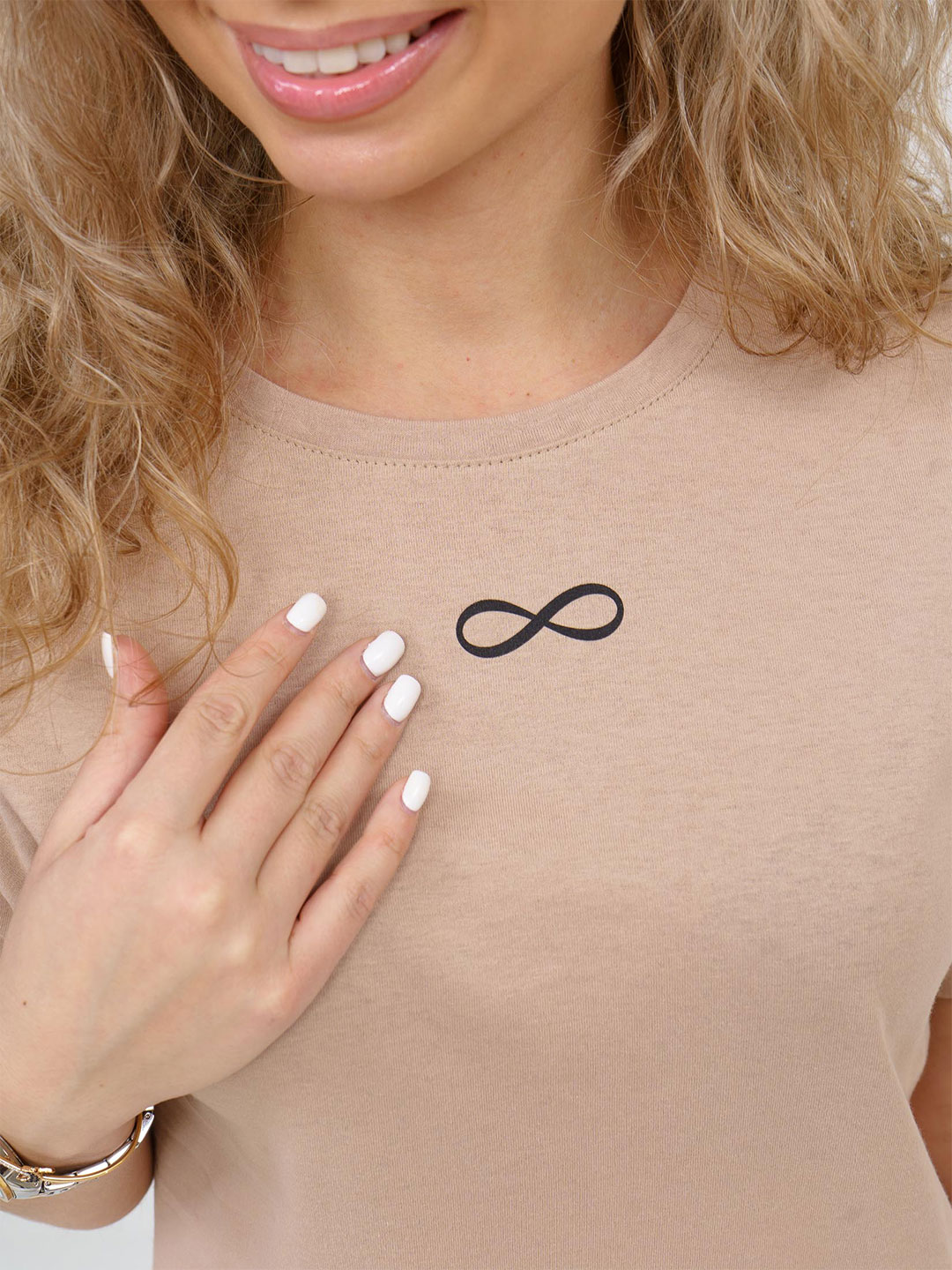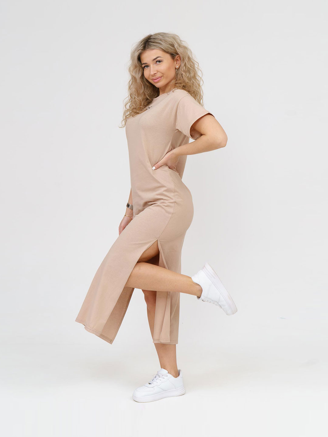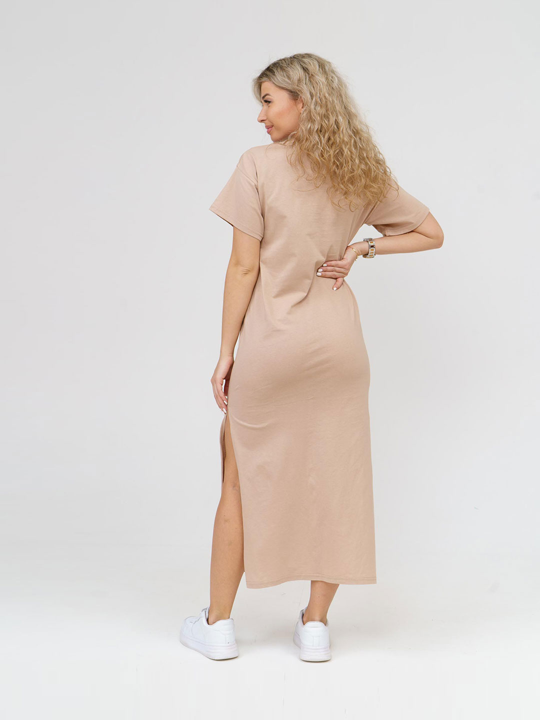 Однотонное платье-футболка с минималистичной печатью - это именно тот предмет гардероба, который может объединить в себе стиль и комфорт. Мягкий и легкий материал, свободный крой, короткие рукава и высокие разрезы по боковым швам позволяют с комфортом использовать платье в жаркую погоду. Такое платье футболка станет отличным выбором на каждый день и подойдет для любых целей, хорошо сочетаясь с самыми разными элементами гардероба.