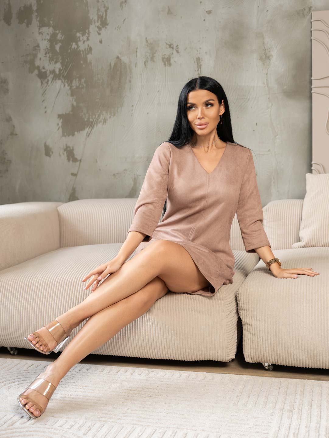 Платье прилегающего силуэта, из искуственной замши, длиной до середины бедра, с V-образной горловиной и рукавом 3/4.Платье отлично впишется в повседневный гардероб, иделально будет смотреться с массивными ботинками или с ботфортами.