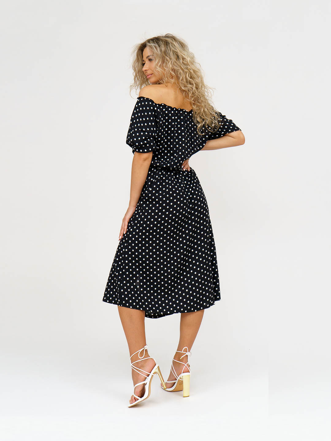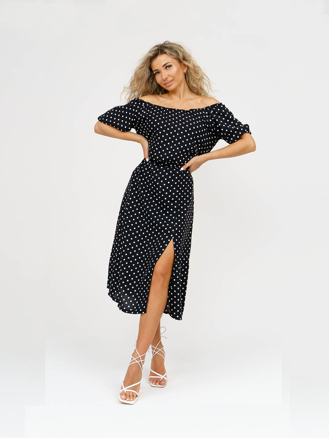 Платье женское с резинкой по горловине и талии, рукав фонарик, юбка с высоким разрезом по ноге, длиной миди. Женское платье из штапеля незаменимо в летнее, весеннее и осеннее время года. Такая модель смотрится прекрасно на любой фигуре, скрывает недостатки и подчеркивая талию. Платье легко комбинируется с любой другой одеждой: косухой, джинсовкой, тренчем.