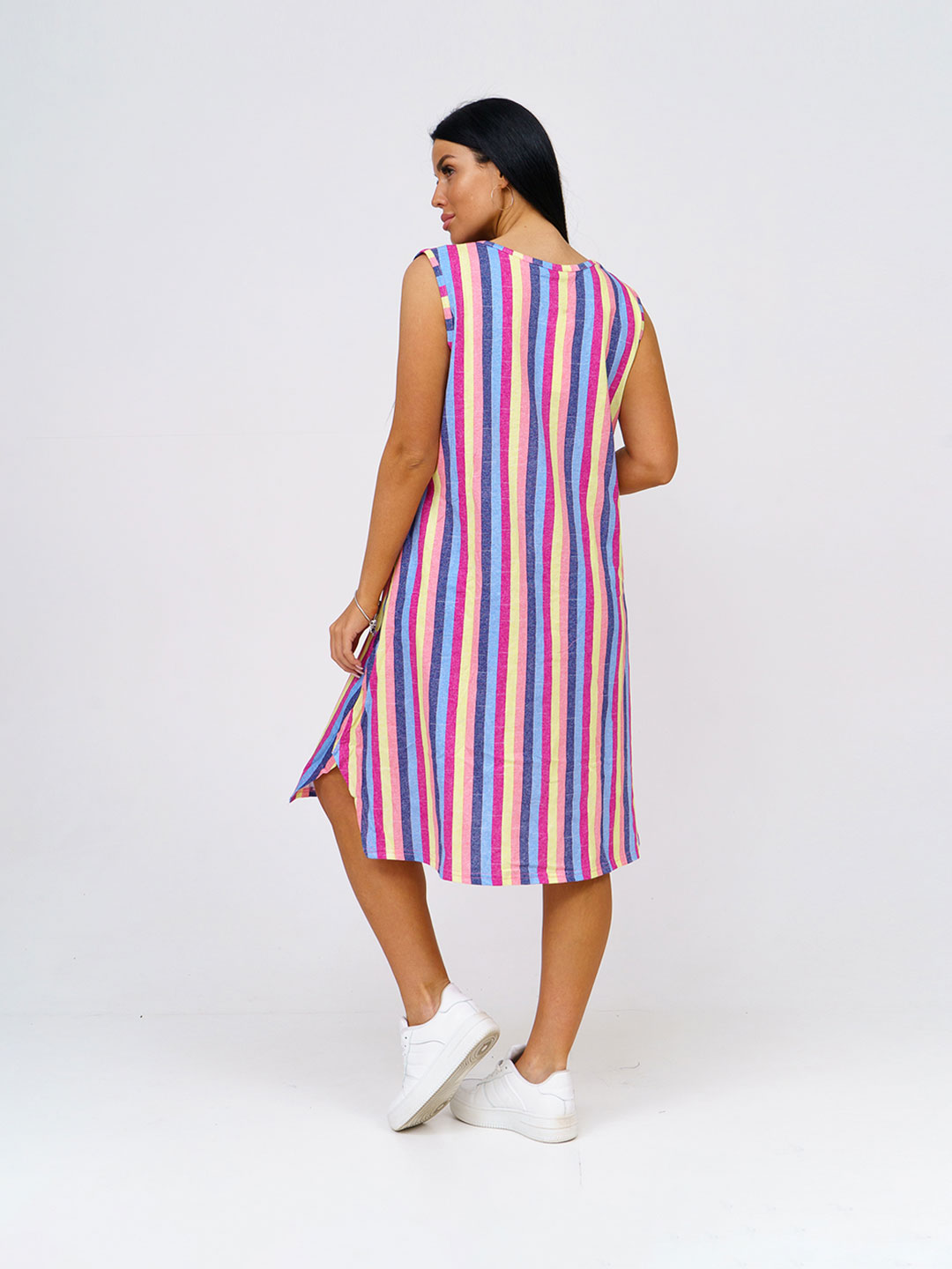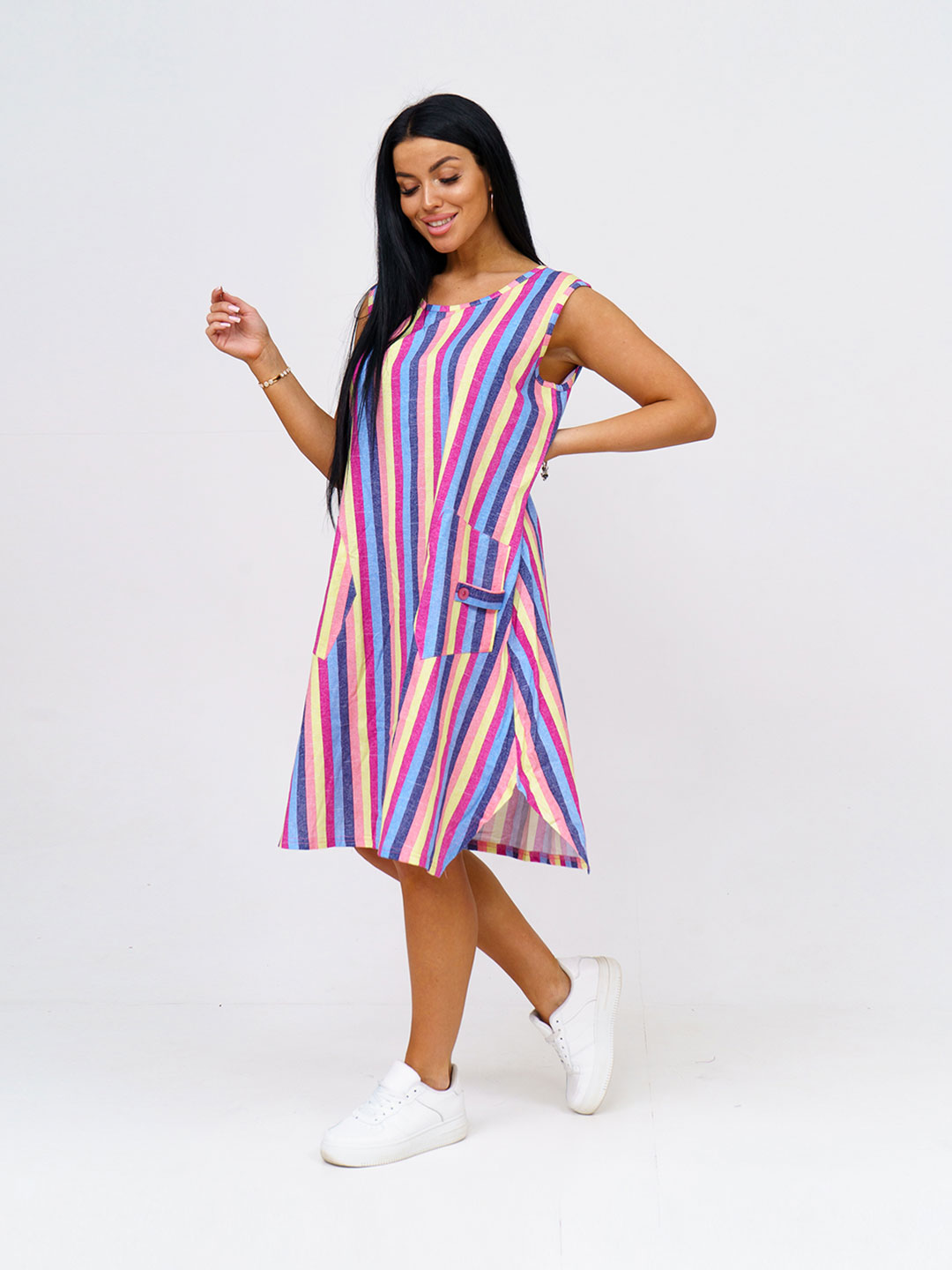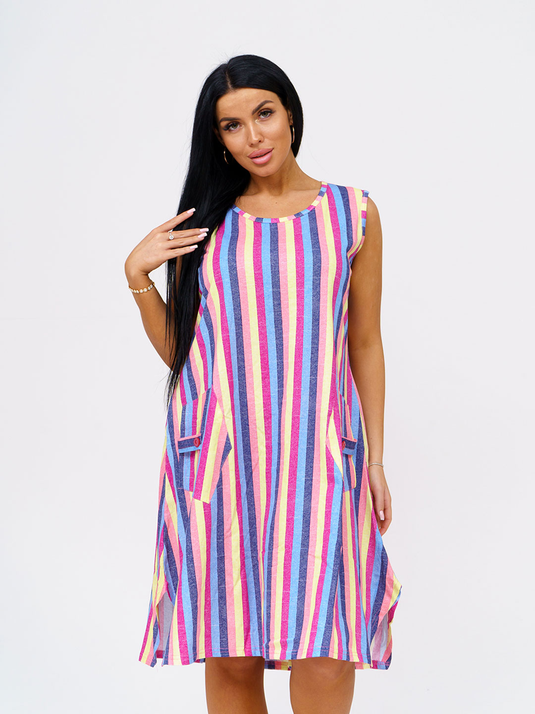 Женское трикотажное платье, длиной до уровня колена. Вырез горловины О-образный, с окантовкой по краю. В боковом шве есть карман.