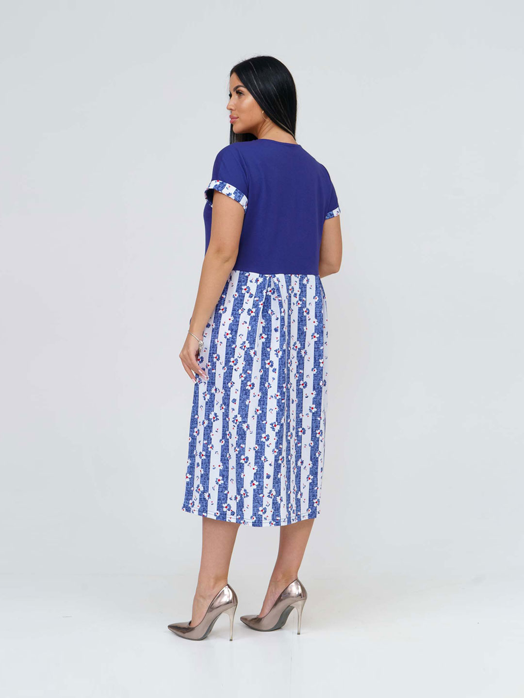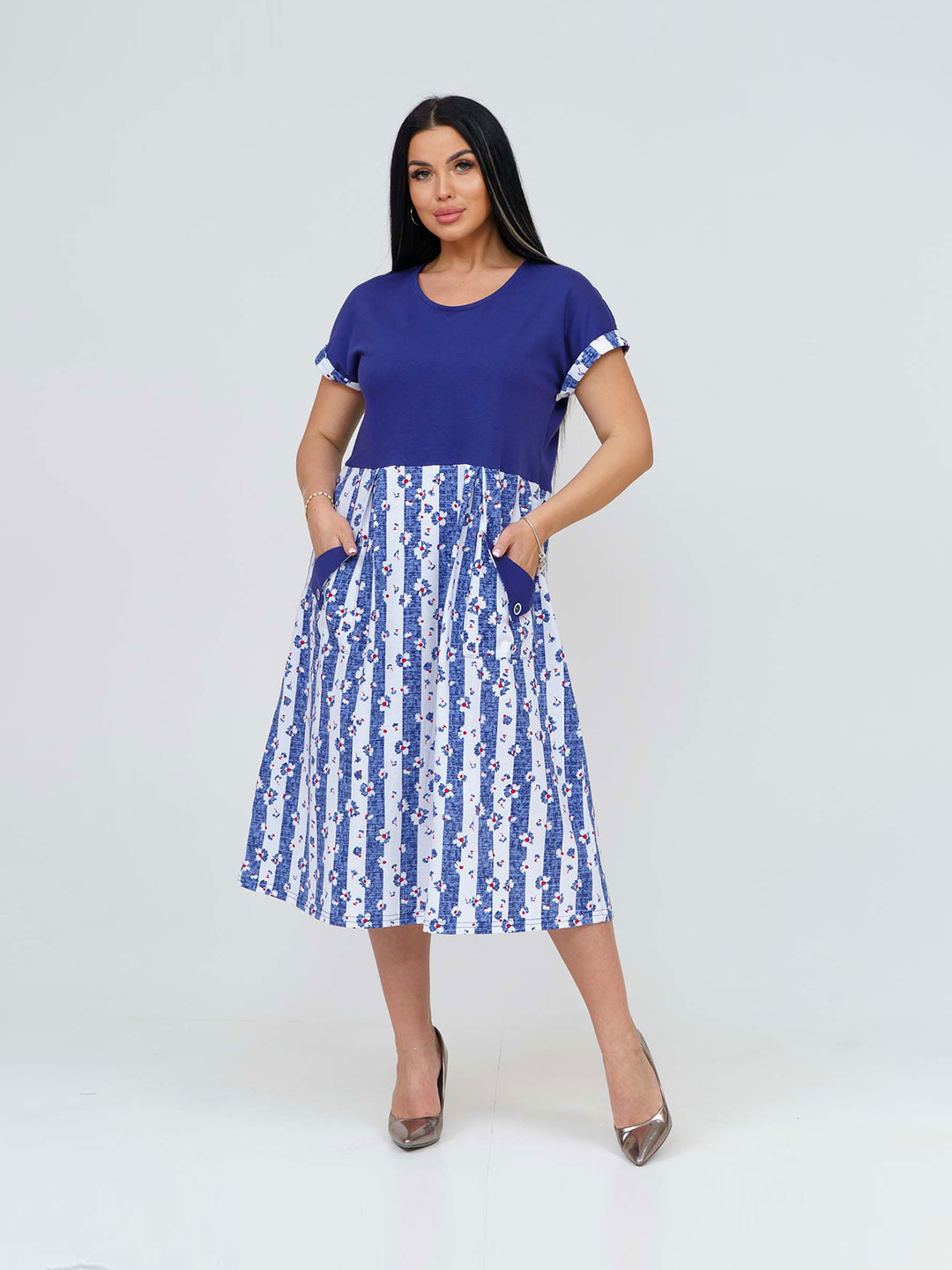 Платье женское трапециевидного силуэта с О-образной горловиной, кокетка на завышенной талии. Рукав цельнокроеный, короткий, манжета с пуговицей. На юбке складки на переде и спинке, накладные карманы с отворотами и пуговицей. Длина платья ниже колен.