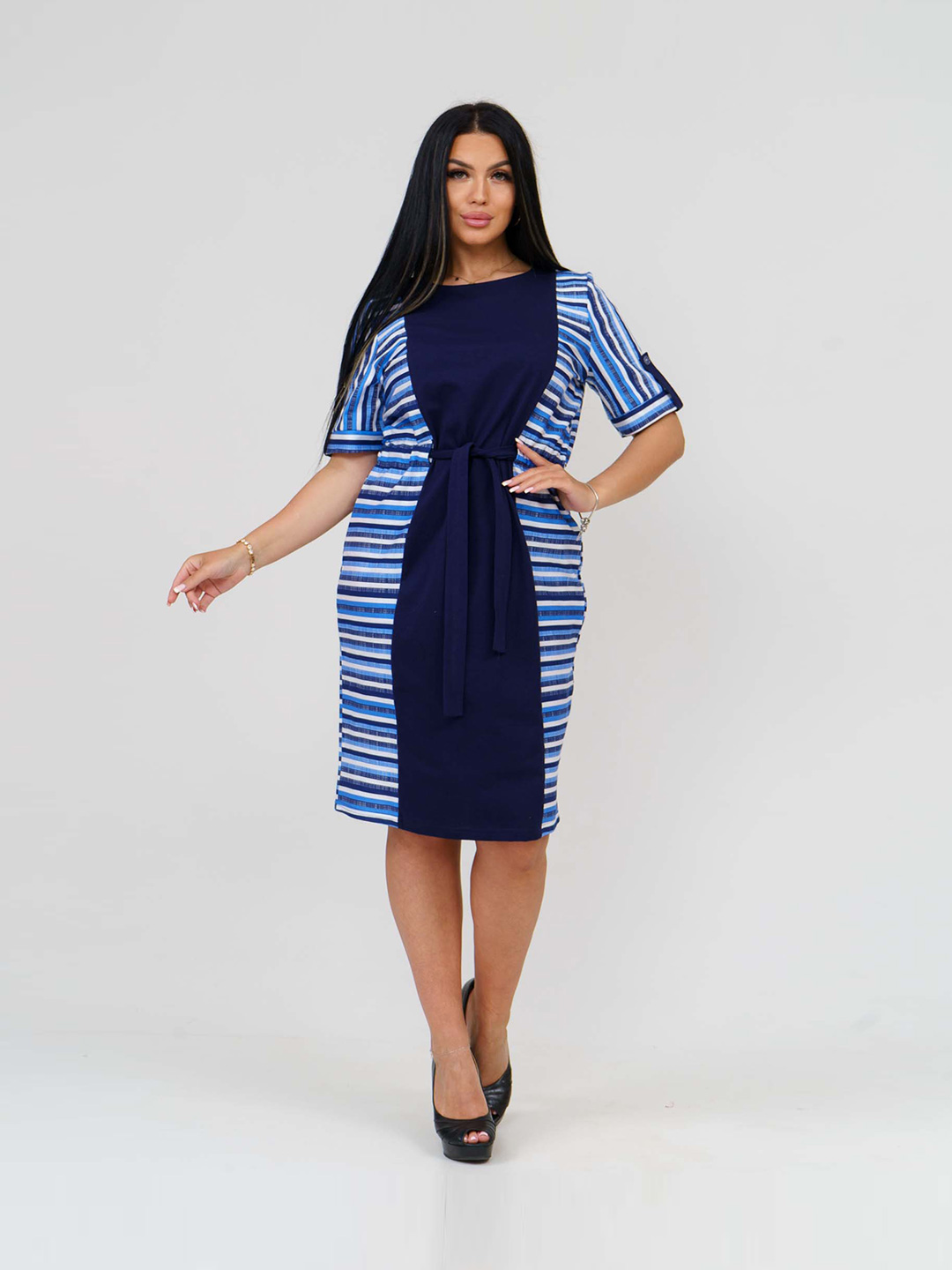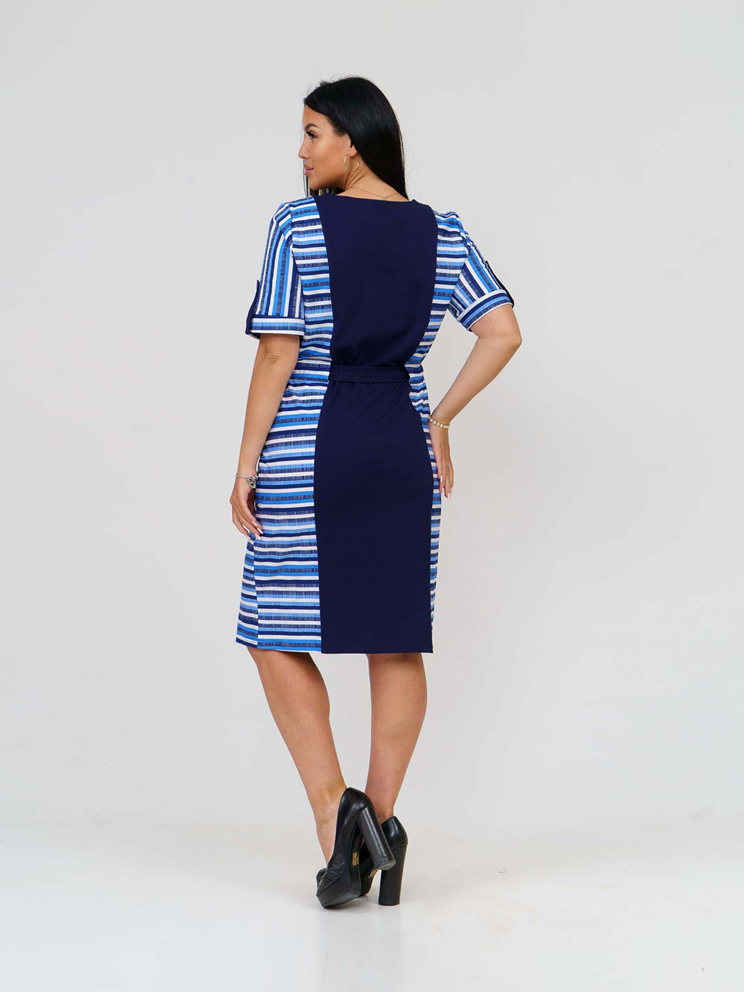 Женское платье полуприлегающего силуэта длиной до колена, коротким рукавом, О-образной горловиной и поясом на кулиске, который подчеркнет талию. Благодаря тканям компаньонам и рельефам платье удивительно стройнит. Наше платье идеально подойдет на работу или на прогулку.