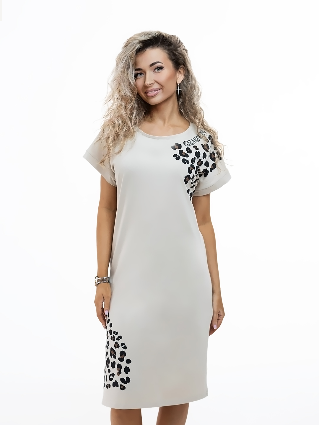 Женское прямое платье, длины миди, с О-образной горловиной, цельнокроеным рукавом с манжетой и разрезами по боковым швам. Спереди две печати одна сверху и одна по разрезу. В составе ткани 92% хлопка, за счет чего в жаркую погоду будет комфортно. Платье отлично будет смотреться с кросовками и джинсовкой.