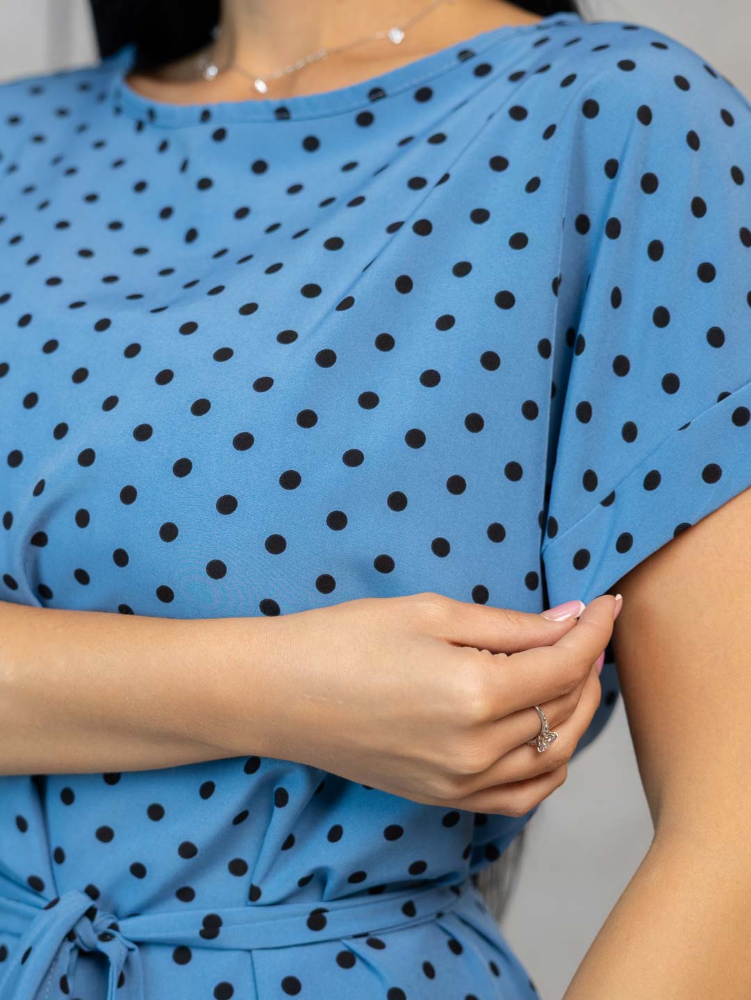 Платье женское с поясом, длиной до уровня колена. Вырез горловины - лодочка. Рукав - короткий, с окантовкой. Мягкий, приятный к телу материал, подарит легкость и повышенный комфорт. Отличный вариант, как для любителей кантри стиля, так и для более деловых и строгих образов.