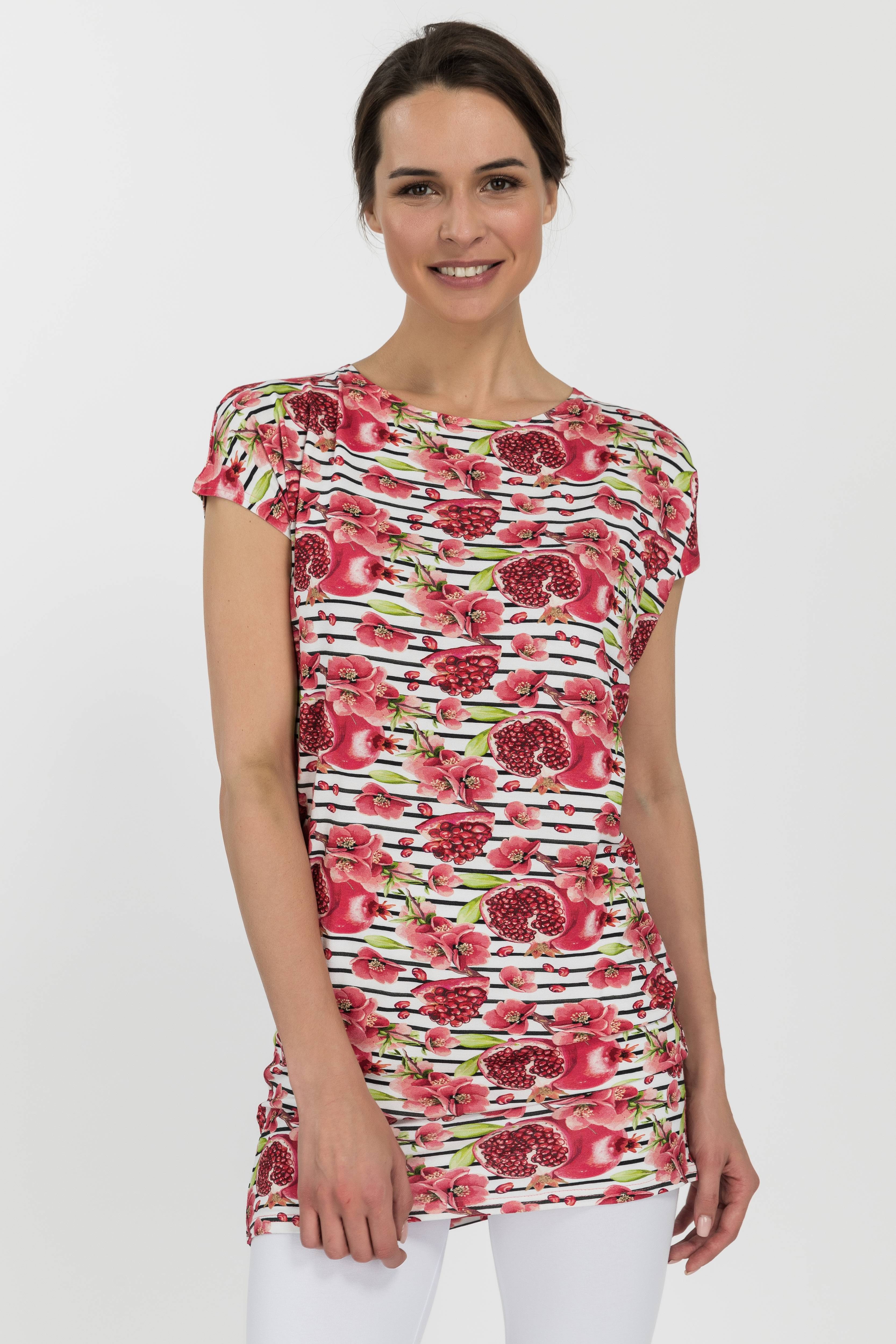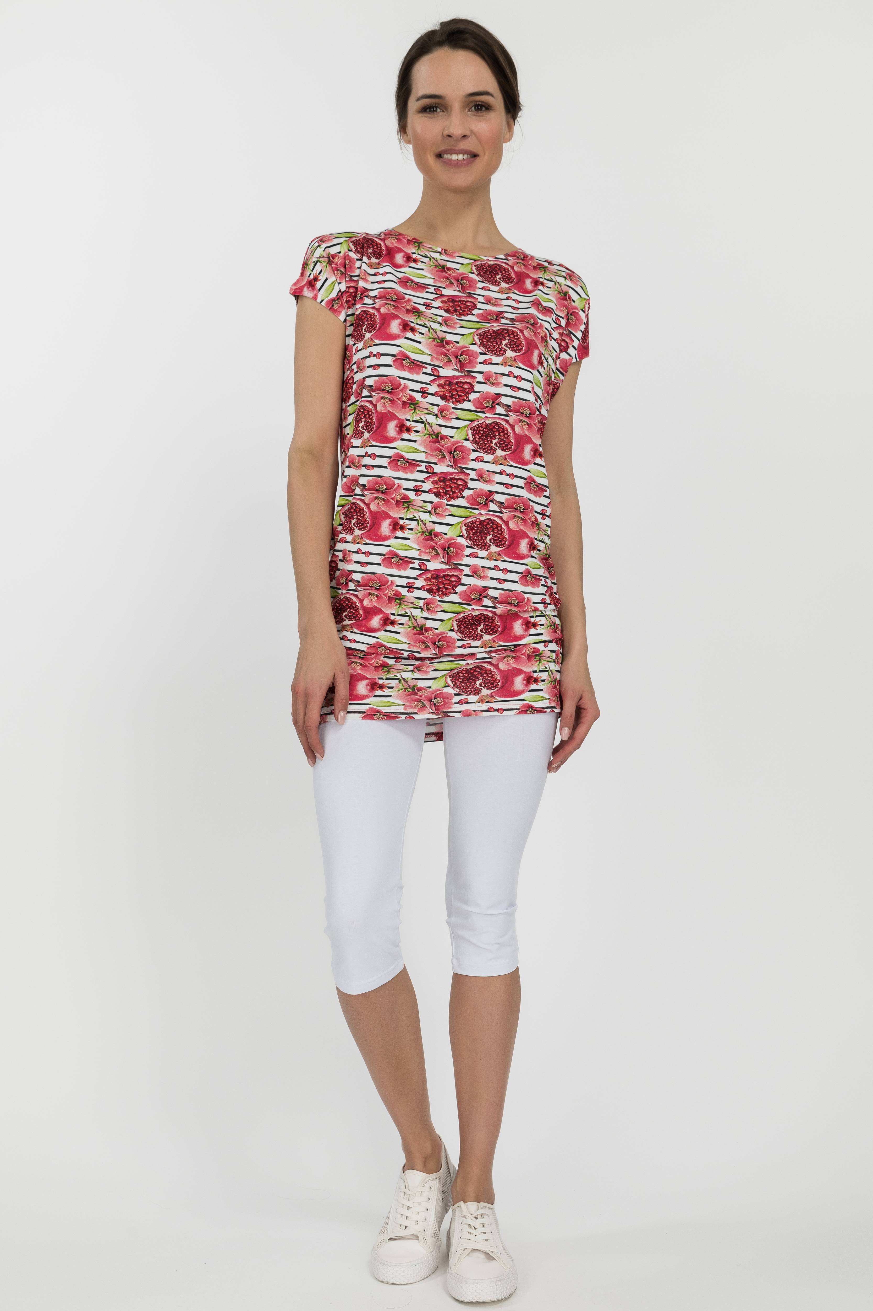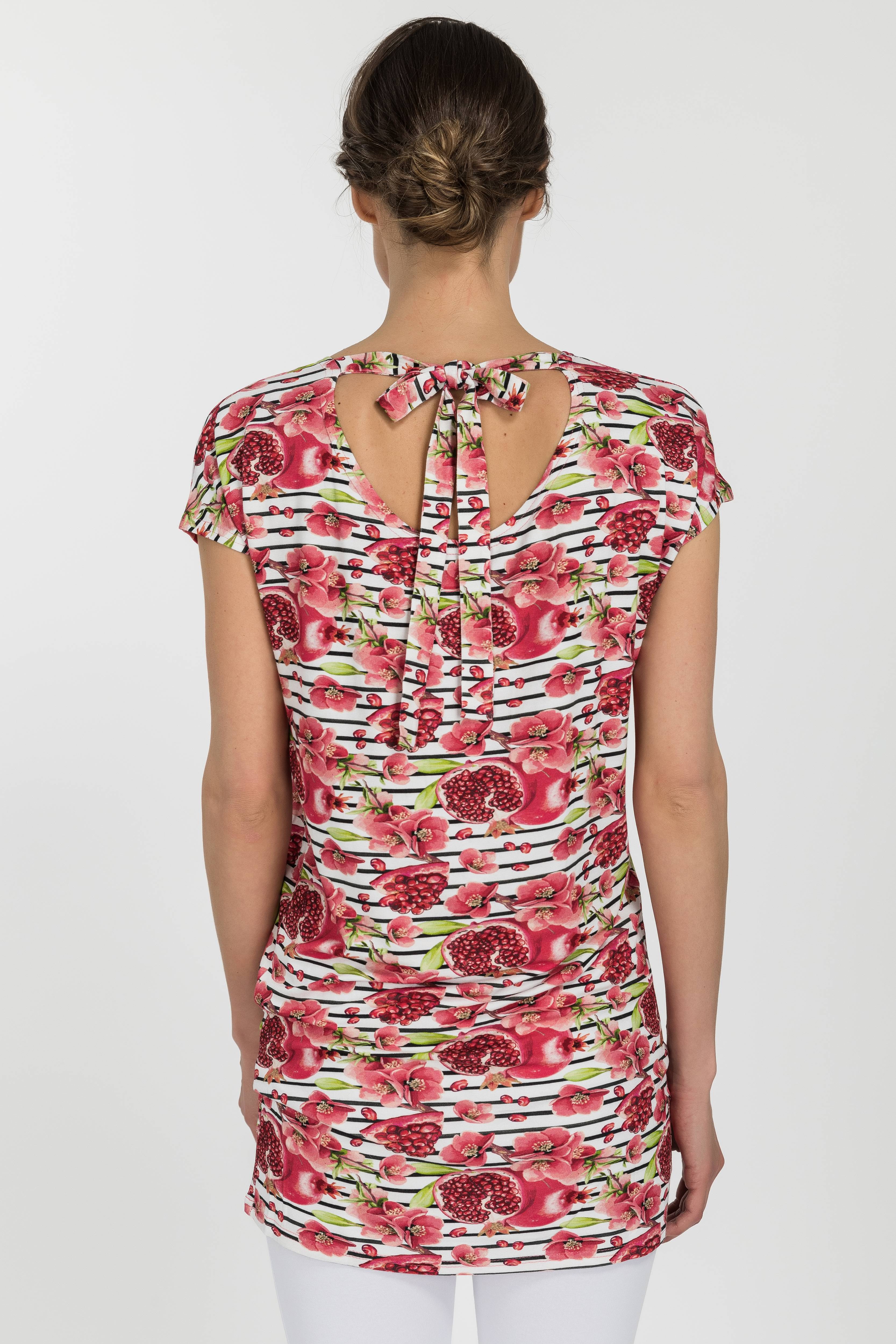 Туника прилегающего силуэта, покроя "летучая мышь", с коротким рукавом, длиной выше колен. Вырез горловины: по полочке - "лодочка", по спинке - круглый, углубленный с завязками на бант. На рост 164 см.