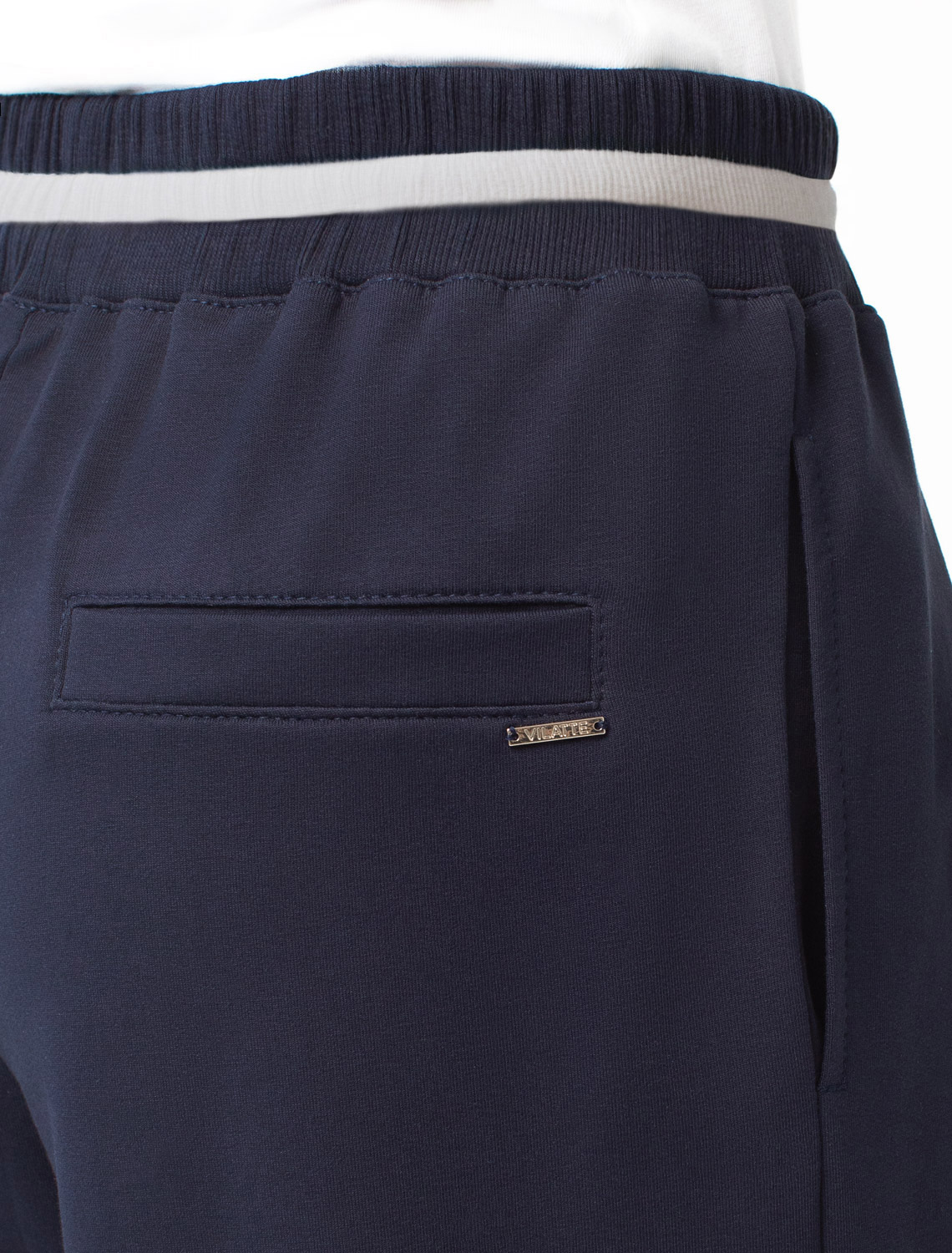 Свободные брюки прямого силуэта выполнены из эластичного футера двухнитки. Длина изделия до щиколотки. В боковых швах расположены карманы. Внутренняя часть кармана из тонкого хлопка в тон полотна. Модель дополнена эластичным поясом, с контрастной полосой и золотистым логотипом бренда. Сочетается в костюме с джемпером D49.083 и D49.086. Правила ухода: использовать жидкое моющее средство (гель для стирки), добавлять к нему кислородный пятновыводитель для цветных вещей, и салфетки (защита от окрашивания). Стирка при 30 градусах, отжим на максимальных оборотах. т.синий