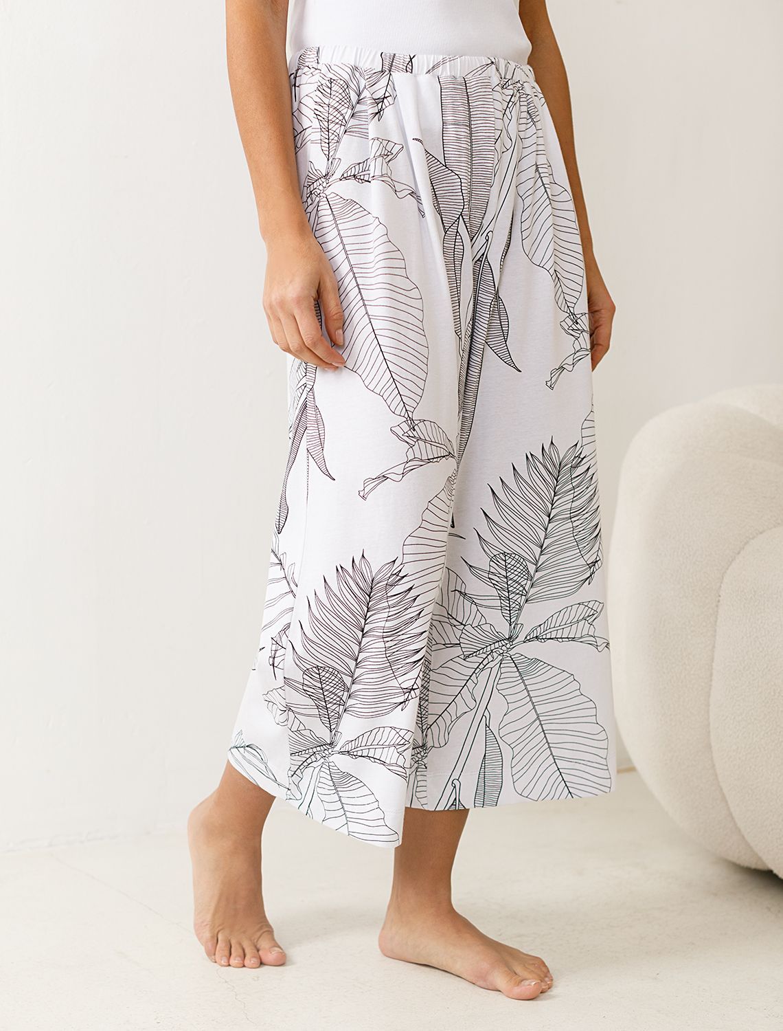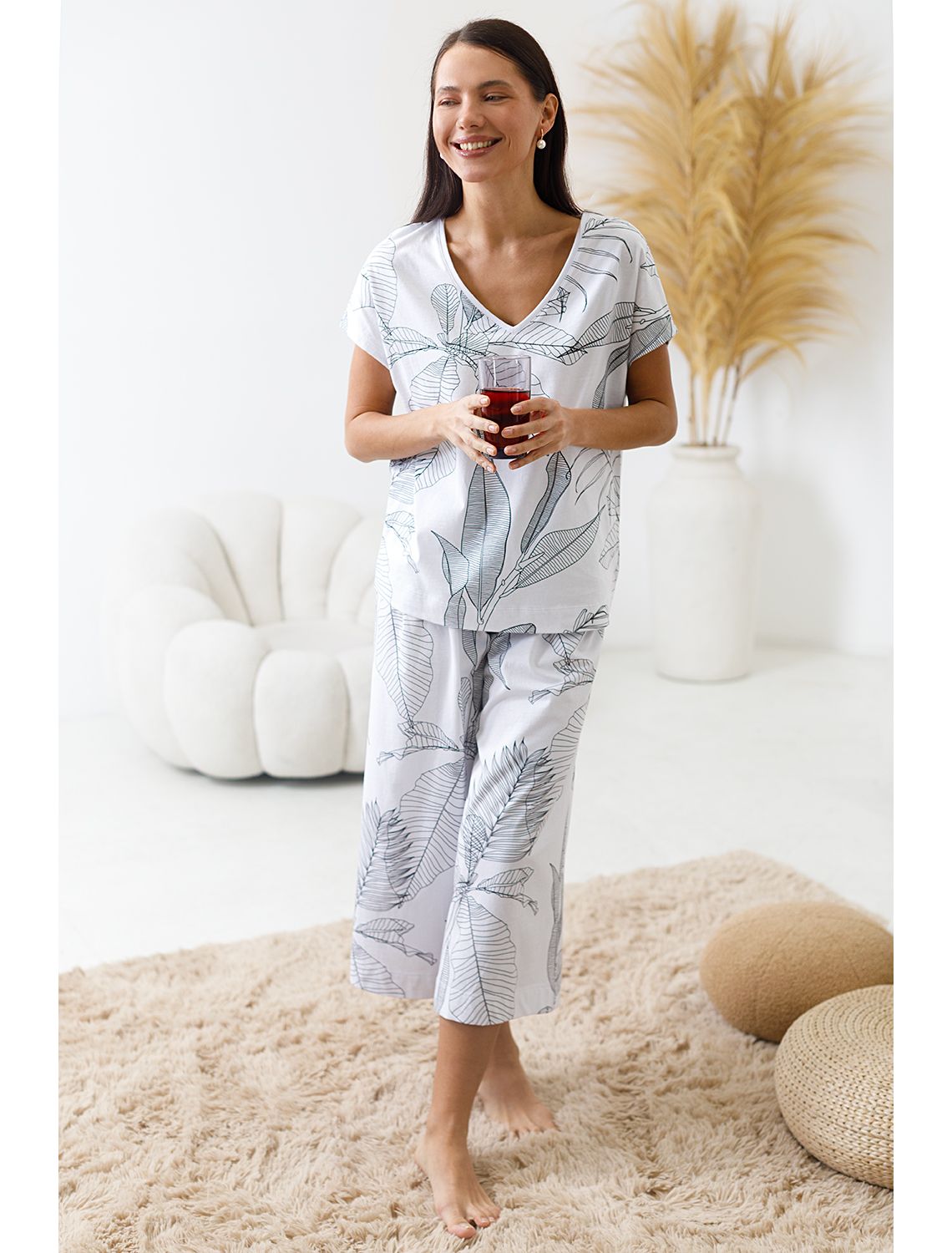 Комфортные укороченные широкие брюки бело-черного цвета на тонкой резинке выполнены из 100% хлопка плотностью 160 Г/м2. Главная особенность этого изделия — тонкое кулирное полотно, которое легче и воздушнее стандартного трикотажа. Благодаря своей деликатной текстуре модель идеально подходит для домашних образов и пижамных комплектов. Ткань отлично «дышит», обеспечивая максимальный уют во время сна и отдыха. Эти свободные брюки обеспечивают максимальную свободу движений благодаря широкому крою. Эластичная резинка в области талии гарантирует удобную посадку и индивидуальное прилегание по фигуре. Защипы добавляют выразительность образу и помогают сформировать актуальный силуэт, подчеркивая современные тенденции. Повседневные брюки с принтом в иде растений подходят для больших размеров, мягко скроют возможные недостатки фигуры, подчеркивая комфорт и стиль. Домашние брюки кюлоты отлично сочетаются с разными вариантами верхней одежды, поэтому их можно носить не только дома, но и на прогулках. Удобные брюки созданы для тех, кто ценит комфорт и практичность без лишних деталей.