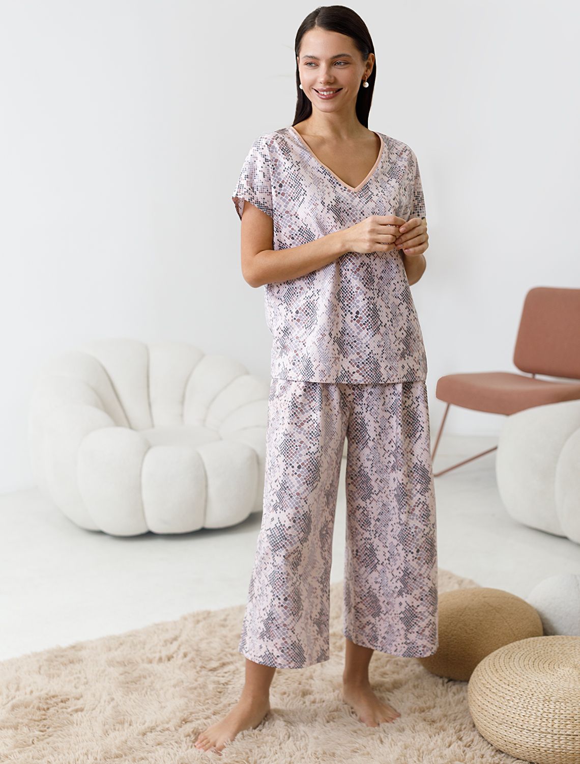 Комфортные укороченные широкие брюки кофейно-пудрового цвета на тонкой резинке выполнены из 100% хлопка плотностью 140 Г/м2. Главная особенность этого изделия — тонкое кулирное полотно, которое легче и воздушнее стандартного трикотажа. Благодаря своей деликатной текстуре модель идеально подходит для домашних образов и пижамных комплектов. Ткань отлично «дышит», обеспечивая максимальный уют во время сна и отдыха. Эти свободные брюки обеспечивают максимальную свободу движений благодаря широкому крою. Эластичная резинка в области талии гарантирует удобную посадку и индивидуальное прилегание по фигуре. Защипы добавляют выразительность образу и помогают сформировать актуальный силуэт, подчеркивая современные тенденции. Повседневные брюки с трендовым змеиным принтом подходят для больших размеров, мягко скроют возможные недостатки фигуры, подчеркивая комфорт и стиль. Домашние брюки кюлоты отлично сочетаются с разными вариантами верхней одежды, поэтому их можно носить не только дома, но и на прогулках. Удобные брюки созданы для тех, кто ценит комфорт и практичность без лишних деталей.