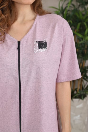 Оптовая продажа. Халат молодежный из трикотажного полотна кулирная гладь с меланжированным эффектом, прямой, свободного кроя, с короткими втачными рукавами, спущенной линией плеча, V-образным вырезом горловины, карманами в боковых швах, центральной застежкой на молнию. Горловина окантована основным материалом. Принт-надпись слева, выполнен методом шелкографии. На спинке, на уровне талии заложена складка, делящая спинку пополам. Удобный свободный крой дарит комфорт и ощущение свободы движений. Одежда из хлопка комфортна и приятна для кожи, дышащая и легкая.
