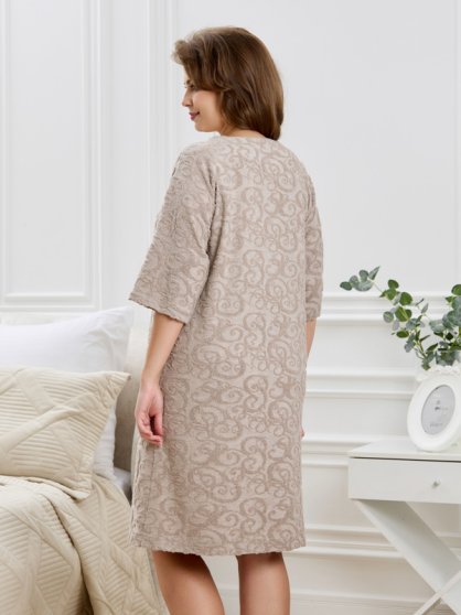 Оптовая продажа. Халат женский из гладкокрашенного трикотажного полотна «махра» со стриженым рисунком. Изделие прямого силуэта, с втачными рукавами – «реглан» длиной до локтя, горловиной V-образной формы, карманами в боковых швах и центральной бортовой застежкой на тесьму «молния». Горловина обработана широкими втачными планками фигурной формы. По нижним срезам рукавов и изделия выполнена широкая подгибка.