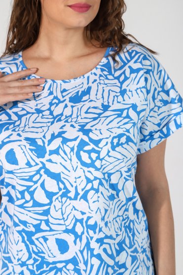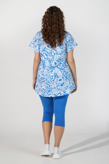 Оптовая продажа. Костюм из трикотажного полотна, состоящий из туники и бриджей. Туника из полотна с абстрактным принтом, свободного покроя, слегка расширенная книзу, с короткими цельнокроеными рукавами на притачных манжетах, окантованной горловиной овальной формы, карманами в боковых швах и фигурной линией низа. Бриджи однотонные из полотна «кулирка» с лайкрой классического покроя, на резинке.