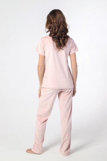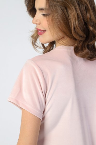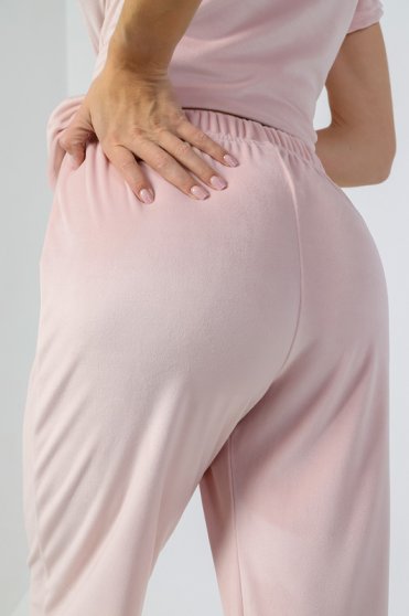 Оптовая продажа. Комплект молодежный из трикотажного полотна велюр-стрейч, состоящий из футболки и брюк, однотонный. Футболка прямая, свободного кроя, с короткими втачными рукавами, овальным вырезом горловины, обработанной втачной бейкой. Брюки прямые, свободного кроя, длинные, пояс с эластичной тесьмой. Данная ткань обладает исключительной мягкостью и приятной текстурой, добавляя изделию изящности и роскоши, создает ощущение комфорта и уюта. Обладает хорошими теплоизоляционными свойствами, что делает его отличным выбором для холодного времени года.