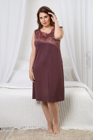 Оптовая продажа. Сорочка женская из вискозного трикотажного полотна с добавлением лайкры, прямая, свободного силуэта, без рукавов, длиной чуть ниже колена. Полочка – с кружевной широкой вставкой, расположенной в области груди, и с кружевной кокеткой в области левого плеча. Горловина и проймы окантованы основным материалом. Преимуществом данного материала является то, что вискоза не электризуется. Данная модель дарит свободу движения, не перетягивает и не доставляет дискомфорта, создает привлекательный образ в домашней обстановке.