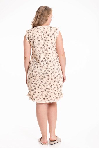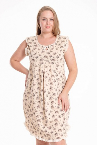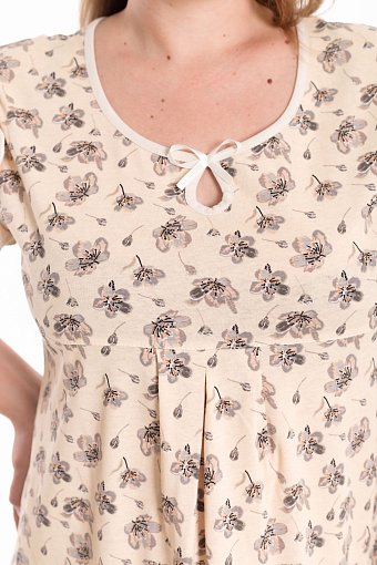 Сорочка женская выполнена из хлопкового полотна с набивным рисунком. Романтическое настроение создают рюши по проймам и низу изделия. Фигурная горловина обработана бейкой, спереди в качестве декора использован бант из атласной ленты.