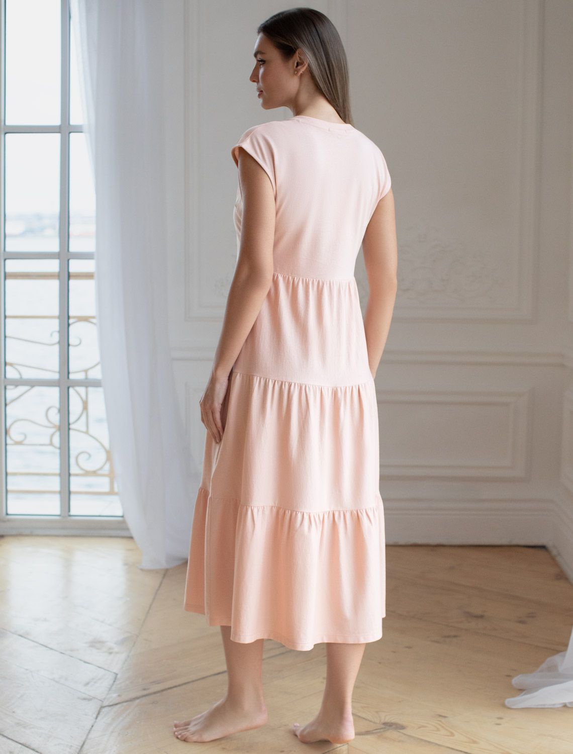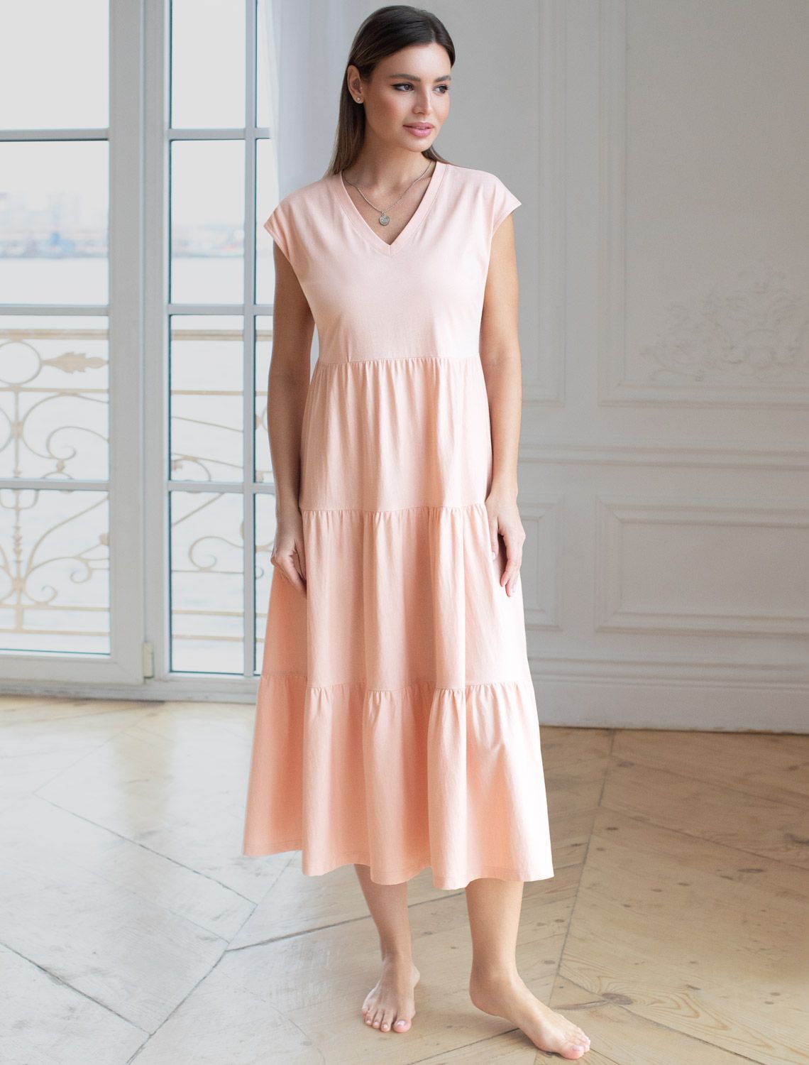 Стильное платье миди с V вырезом нежного пудрового цвета выполнено из 100% хлопка плотностью 140 Г/м2. Главная особенность этого изделия — тонкое кулирное полотно, которое легче и воздушнее стандартного трикотажа. Благодаря своей деликатной текстуре модель идеально подходит для домашних образов и пижамных комплектов. Ткань отлично «дышит», обеспечивая максимальный уют во время сна и отдыха. Платье ярусного кроя красиво подчеркивают фигуру, скрывая возможные недостатки и акцентируя достоинства. Свободное платье отлично подойдет на большие размеры. Длина платья миди обеспечивает гармоничное сочетание комфорта и элегантности, подходя для разных поводов. V-образное декольте придает образу нежность и женственность, а ярусная конструкция добавляет образу эффект воздушности и динамичность. Материал натуральный и приятный к телу, создает ощущение легкости и свежести. Такое повседневное платье подчеркнет индивидуальность и стиль.