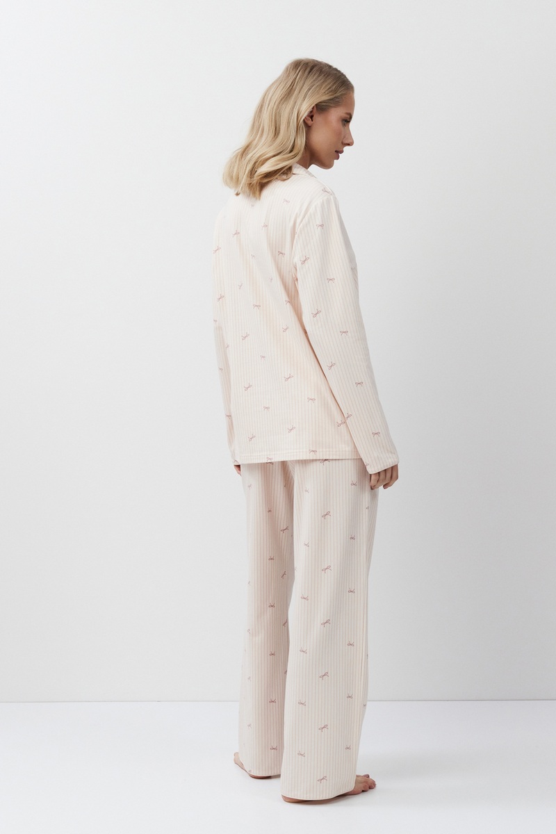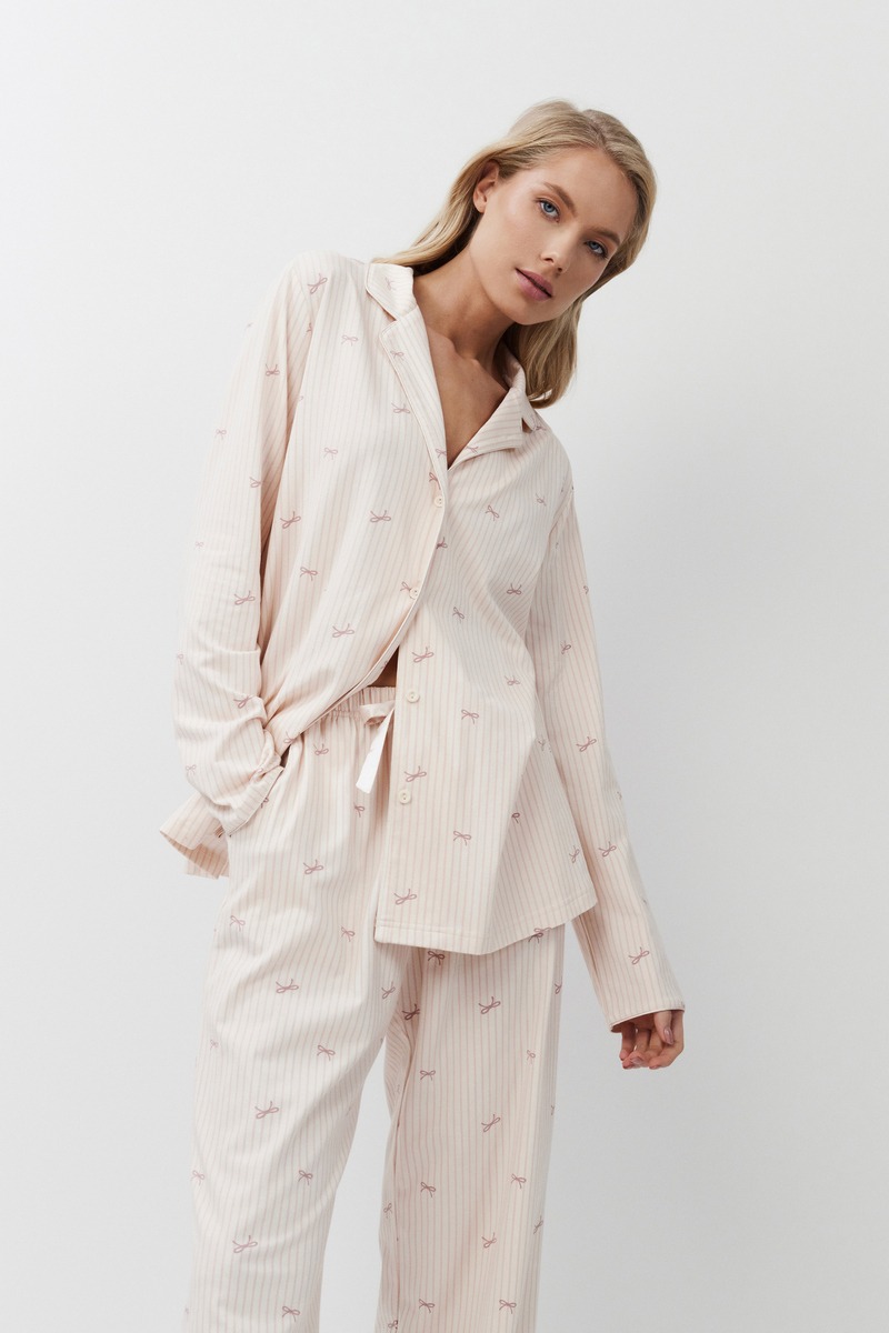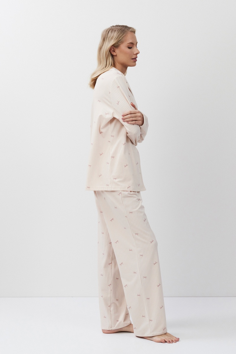 Пижама женская со штанами ROMIE для максимального комфорта и расслабления. Выполнена из приятной к телу мягкого модала с хлопком. Рубашка на пуговицах, с отложным воротником и V-образным вырезом. Рукава длинные. Штаны длинные, свободные, с комфортной посадкой, эластичный пояс со шнурком. Пижама станет вашим идеальным спутником во время сна. 48% модал/ 48% хлопок/ 4% эластан