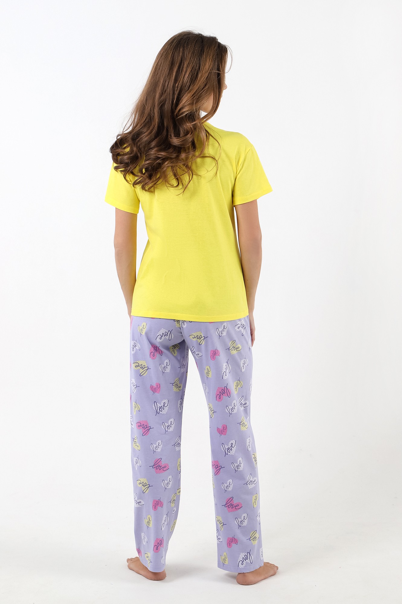 Пижама молодежная из трикотажного полотна «кулирка» в комбинации двух видов: гладкокрашеного и с набивным рисунком, состоящая из футболки и брюк. Футболка – из гладкокрашеного полотна, классического покроя, с короткими втачными рукавами, горловиной овальной формы, обработанной притачной бейкой и принтом на полочке, выполненным в технике «шелкографии».Брюки – из полотна с набивным рисунком, классического покроя, с эластичной тесьмой по талии.