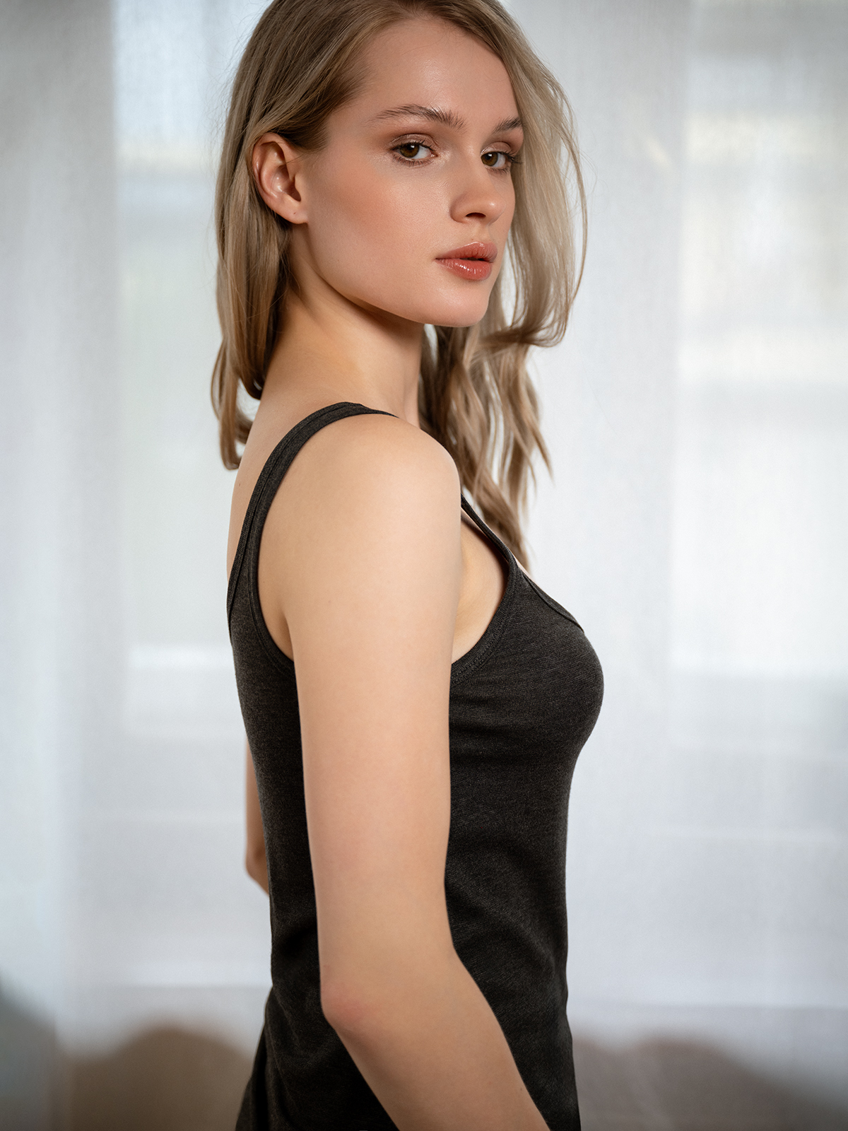 Женская майка Indefini выполнена в глубоком темно-сером оттенке с едва заметной меланжевой текстурой — идеальный выбор для тех, кто ценит лаконичный дизайн и безупречную посадку. Модель с широкими бретелями и глубоким V-образным вырезом создана для максимального комфорта и свободы движений.