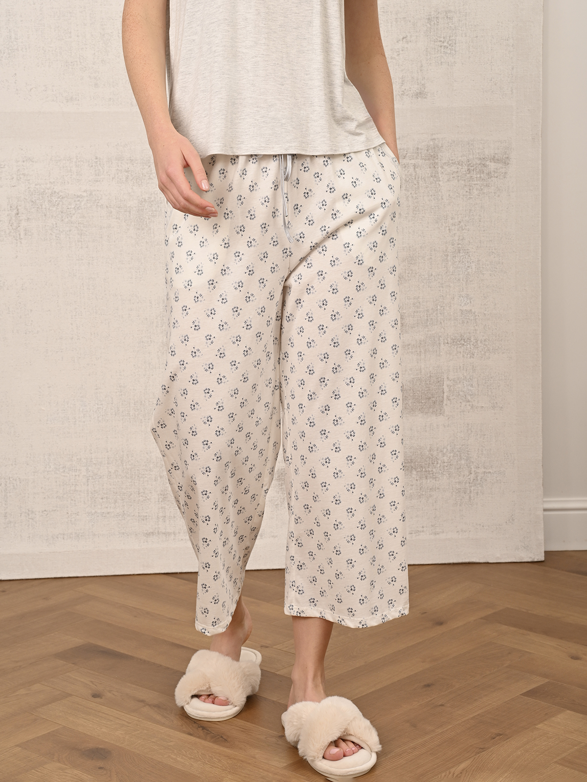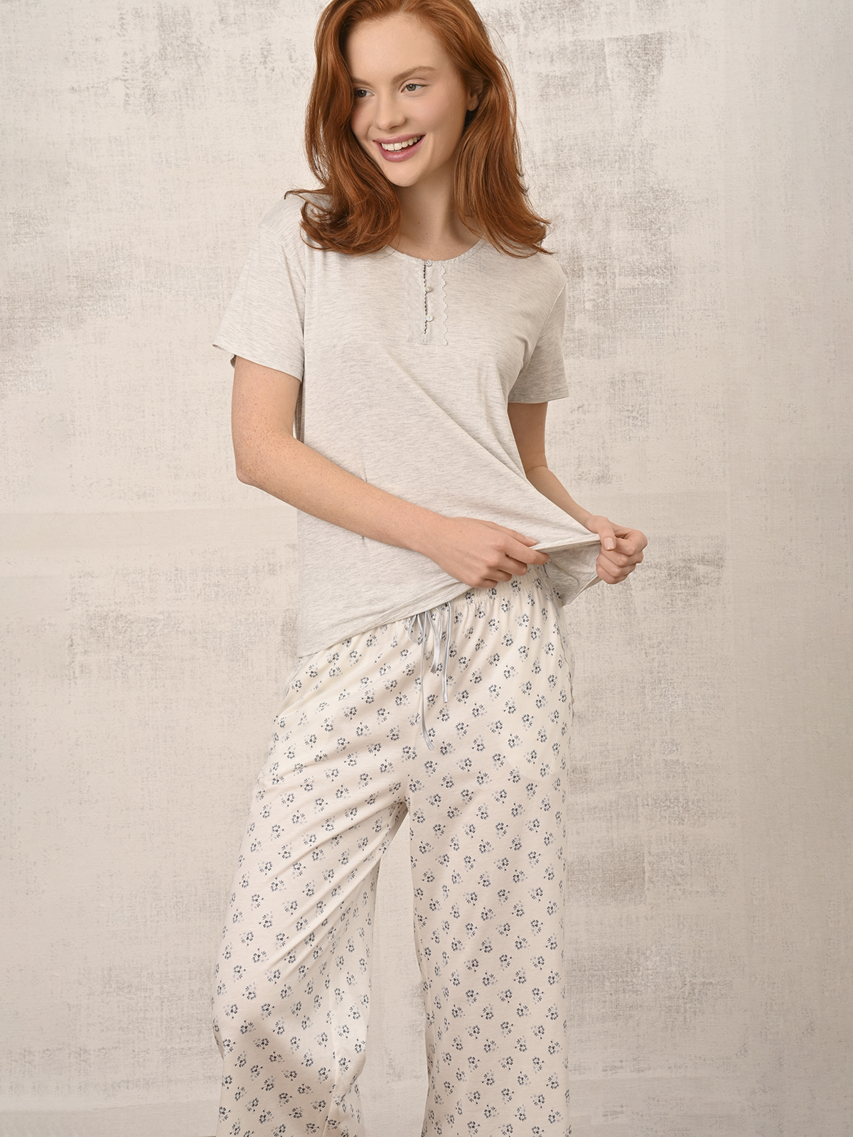 Пижама с брюками из хлопка — дышащая, мягкая, она не только комфортна в носке, но и подойдет для любого типа фигуры. Выполнена в универсальном спокойном оттенке с нежным цветочным принтом. Планка с пуговицами оформлена кружевной окантовкой, её можно слегка растянуть, если хочется более свободной посадки. Брюки с глубокими карманами. На поясе атласный шнурок. Мягкая резинка не натирает, а небольшое количество эластана в составе делает белье долговечным и эластичным.