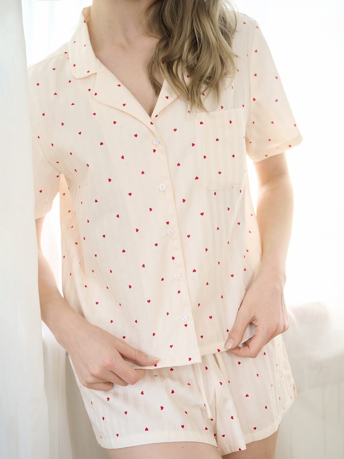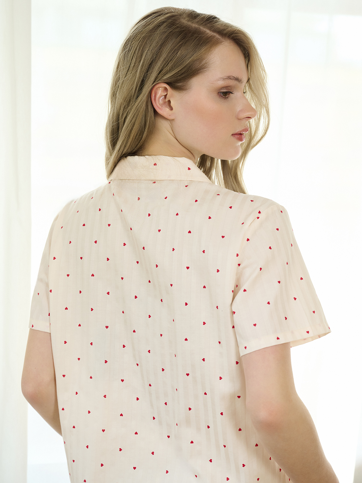 Выполнена в молочном цвете с мелким принтом из красных сердечек.