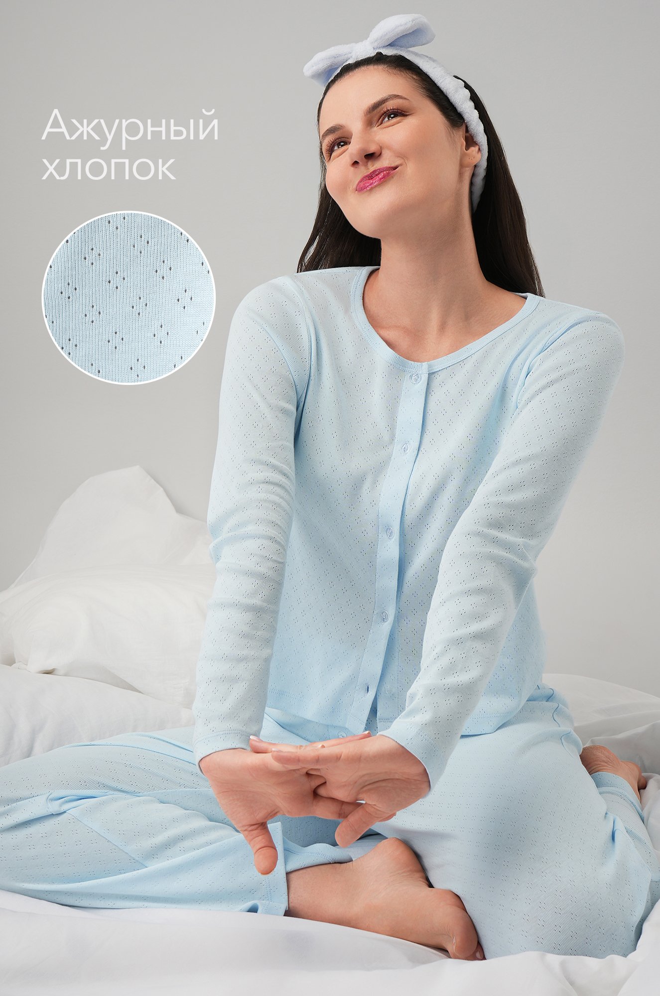 Голубая пижамка с брюками — уют, который всегда под рукой. Ажурная фактура и мягкий трикотаж создают приятные ощущение с первого прикосновения.