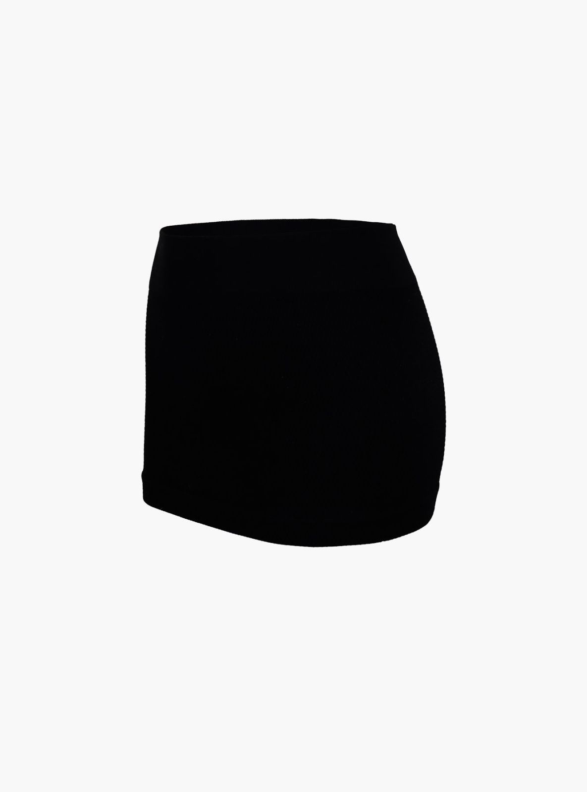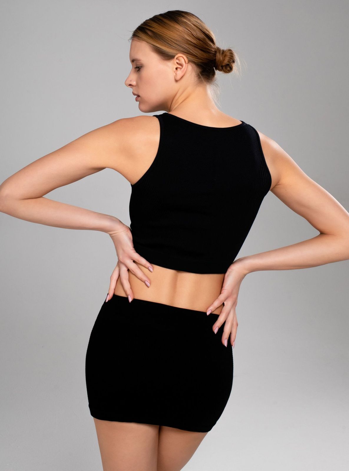 Юбка черного цвета, изготовлена из гладкой микрофибры без боковых швов, резинки в рубчик плотно фиксируют изделие на теле, не перетягивая и не сдавливая.