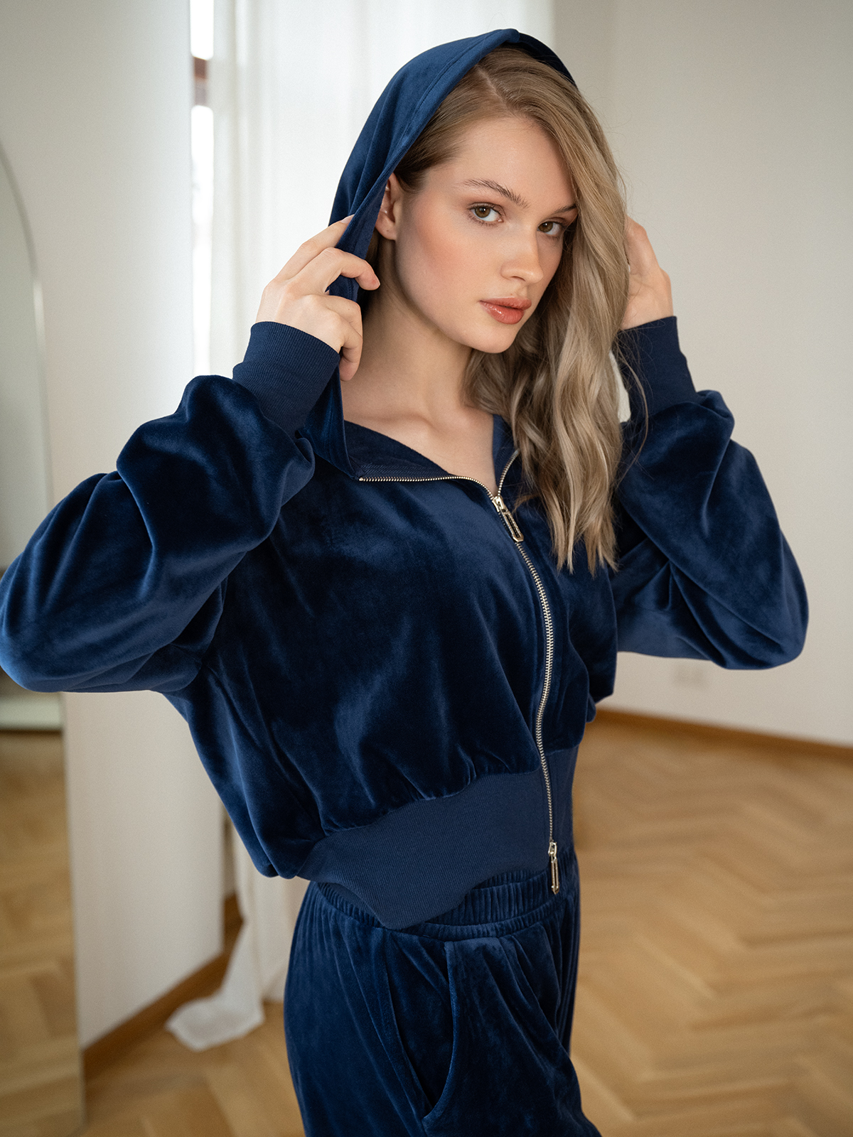 Женский велюровый костюм Indefini выполнен в насыщенном темно-синем цвете. Комплект состоит из укороченной толстовки на молнии с капюшоном и длинными рукавами, а также прямых брюк на мягкой эластичной резинке.
