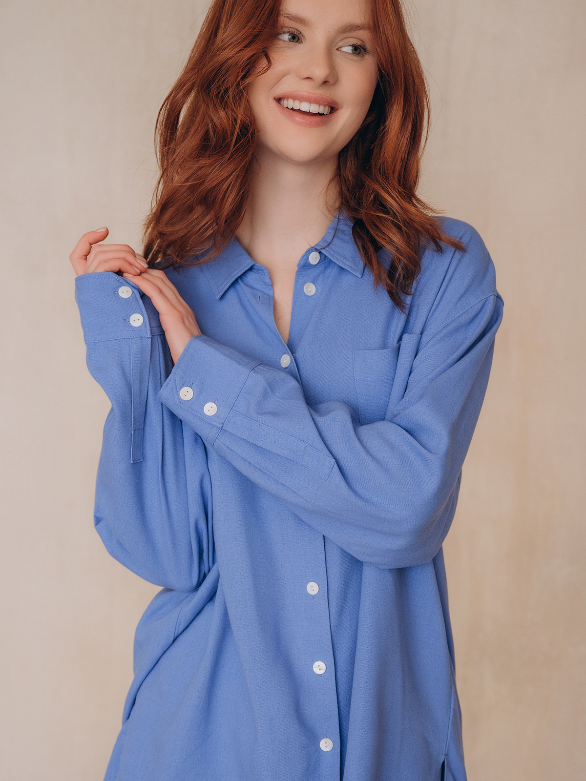 Рубашка на пуговицах с длинными рукавами и отложным воротником имеет нагрудный карман.