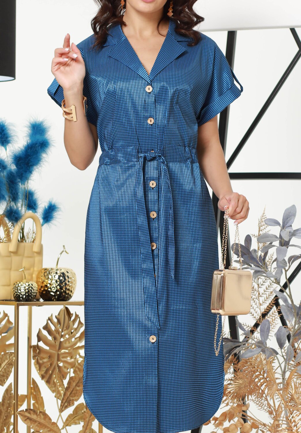 Платье-рубашка, легкое и комфортное. Полноценная застежка на пуговицы, поясок в кулиске, паты с пуговицами на рукавах и пиджачный воротник - все это создает эклектический современный образ. Подол платья оформлен полукругом с небольшими вырезами по бокам.