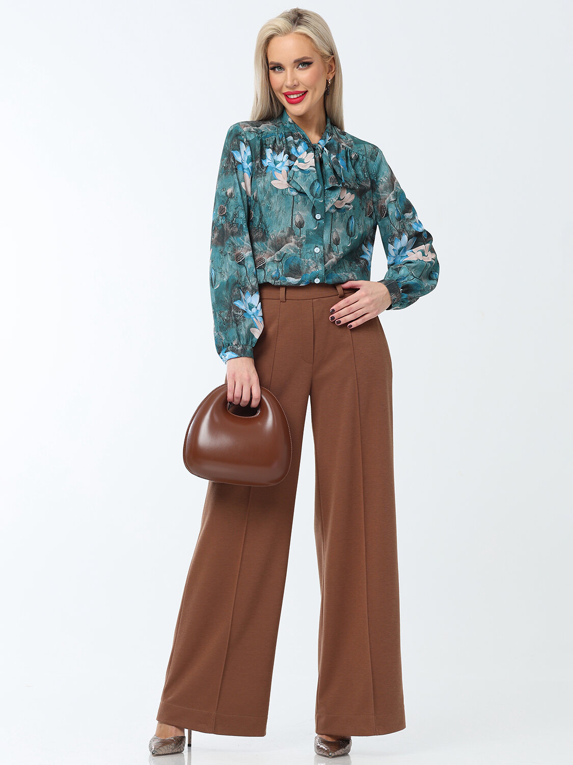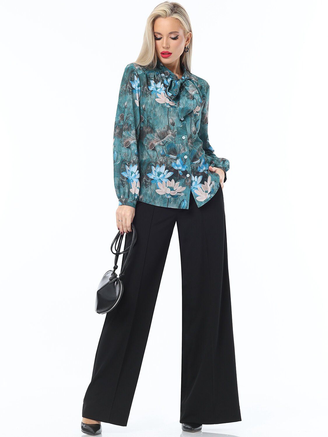 Элегантная блузка с воротником-галстуком на любой случай. Пышные рукава и возможность завязывать галстук бантом придают образу романтическую основу. Подчеркивает стиль и выбор ткани. Функциональная застежка на пуговицы и манжеты на них же, как в рубашке, отвечают за классику. А удобная длина и оформленный низ с небольшими разрезами по бокам позволяют одинаково успешно сочетать блузку с другими элементами гардероба как навыпуск, так и заправленную.