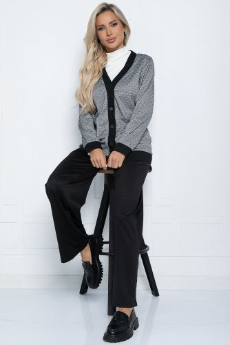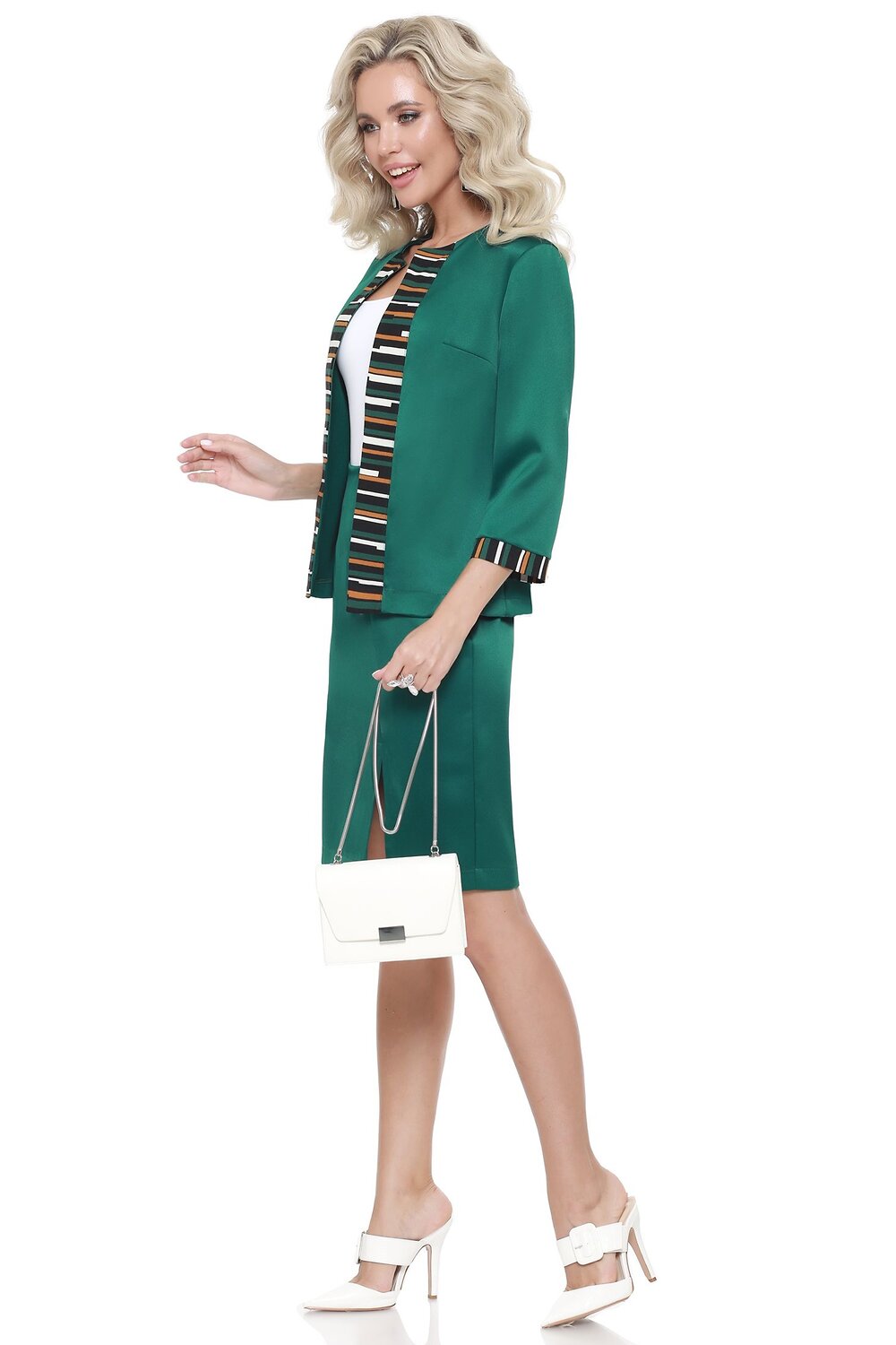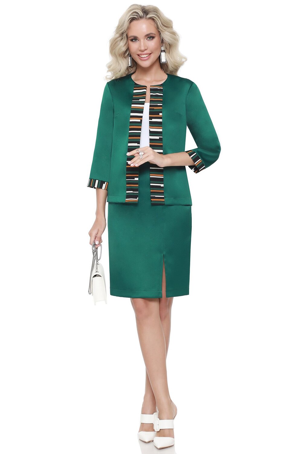 Идеальный офисный костюм. Юбка с разрезом на левой ноге спереди выглядит классически, при этом более удобна, чем такая же модель без разреза, а его расположение максимально удобно, даже когда вы сидите. Жакет с рукавом три четверти без застежки оформлен планкой и манжетами из той же ткани, что и юбка, что придает костюму гармоничности.