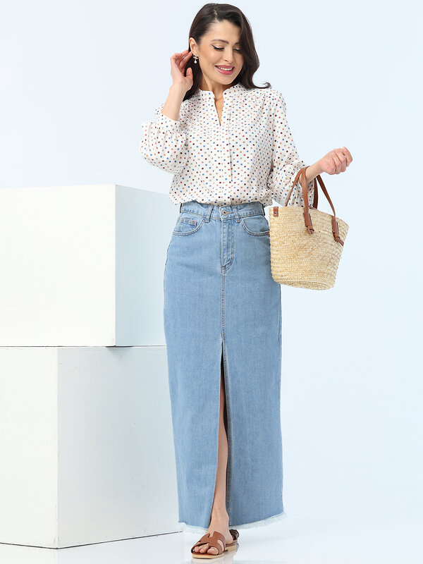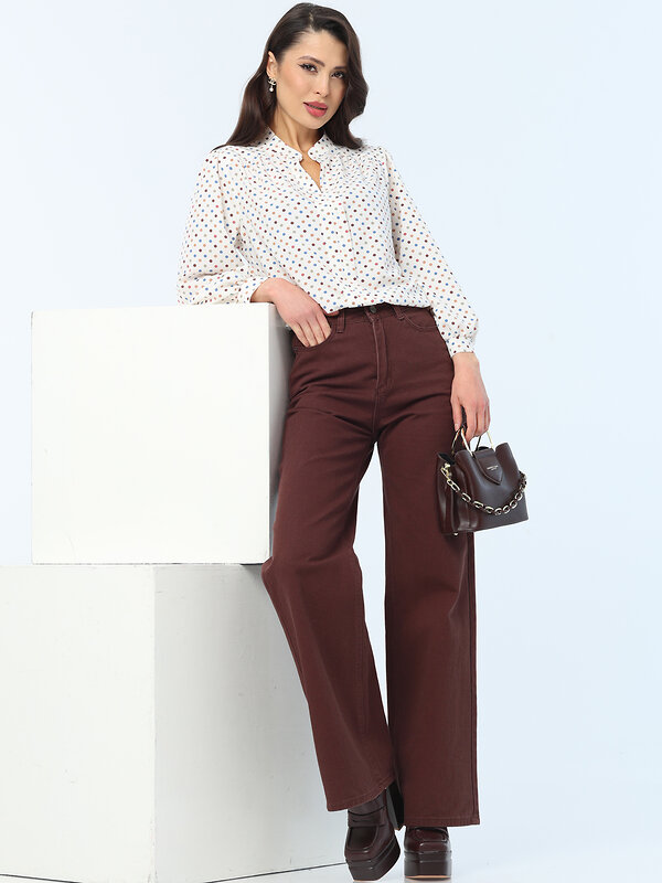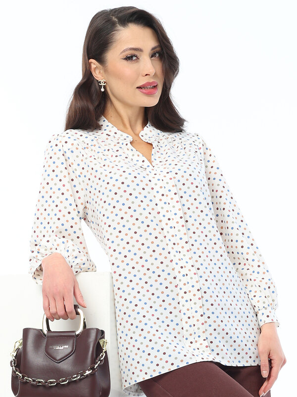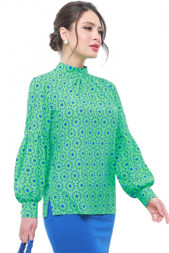 Женственная блузка на каждый день. Планки, имитирующие застежку, визуально делят фигуру и тем самым стройнят. Укороченный рукав достаточно пышный, чтобы производить впечатление. Лучше всего будут смотреться в сочетании с юбками, но также можно носить ее навыпуск с брюками, а также длина позволяет гармонично дополнить ее поясом.