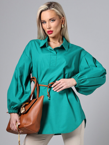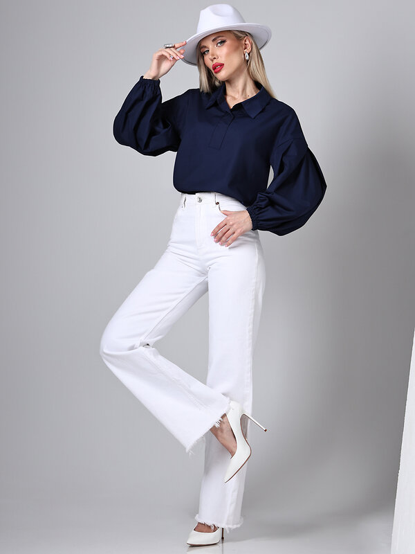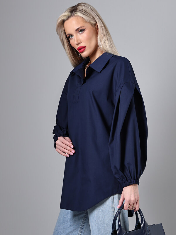 Удлиненная блузка темно-синего цвета выполнена из сорочечной ткани. Объемные рукава создают выразительный силуэт, а спущенная линия плеча обеспечивает удобство при движении. Рубашечный воротник добавляет строгости, делая блузку уместной для офисного гардероба. Удлиненный крой позволяет сочетать модель с брюками, юбками или джинсами. Сорочечная ткань обеспечивает воздухопроницаемость и приятные тактильные ощущения. Блузка подходит для создания как повседневных, так и более нарядных образов, сохраняя стиль и функциональность. Уход за блузкой требует бережной стирки при температуре 30 градусов, что помогает сохранить качество ткани и форму изделия.