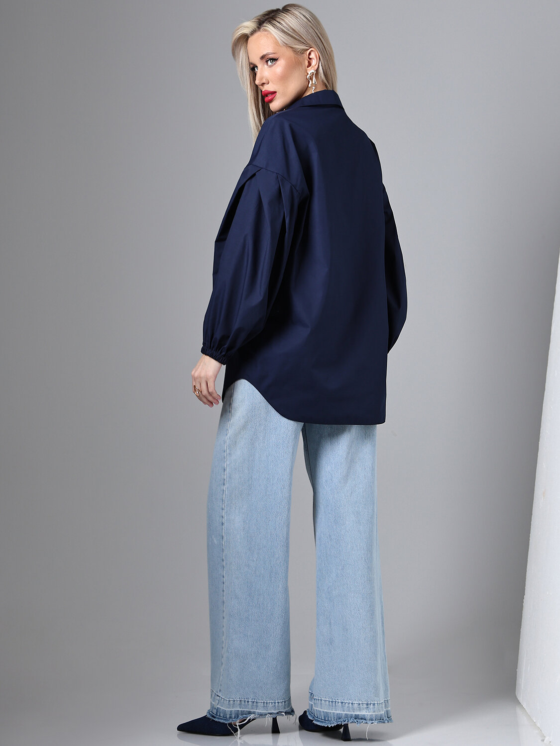 Удлиненная блузка темно-синего цвета выполнена из сорочечной ткани. Объемные рукава создают выразительный силуэт, а спущенная линия плеча обеспечивает удобство при движении. Рубашечный воротник добавляет строгости, делая блузку уместной для офисного гардероба. Удлиненный крой позволяет сочетать модель с брюками, юбками или джинсами. Сорочечная ткань обеспечивает воздухопроницаемость и приятные тактильные ощущения. Блузка подходит для создания как повседневных, так и более нарядных образов, сохраняя стиль и функциональность. Уход за блузкой требует бережной стирки при температуре 30 градусов, что помогает сохранить качество ткани и форму изделия.