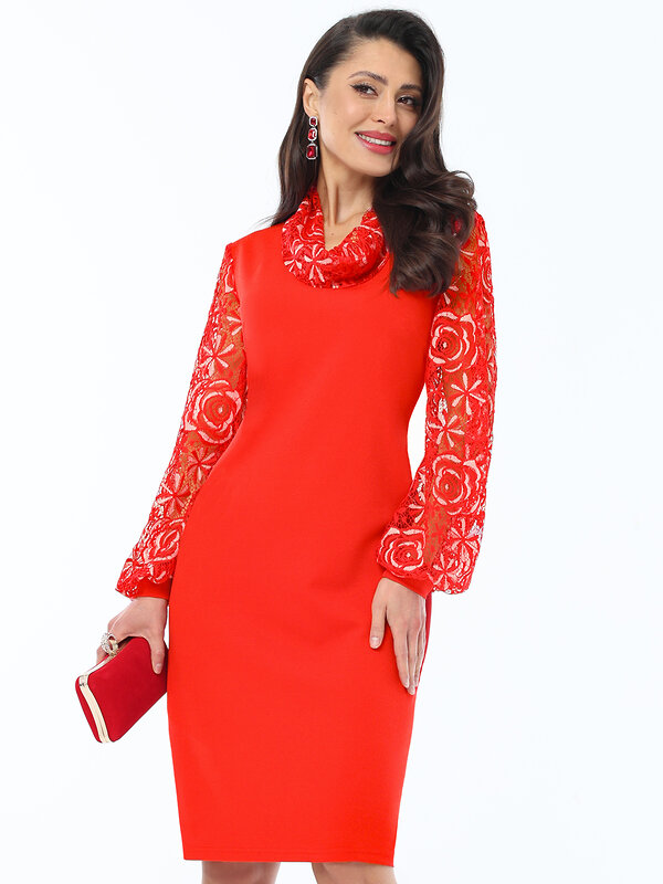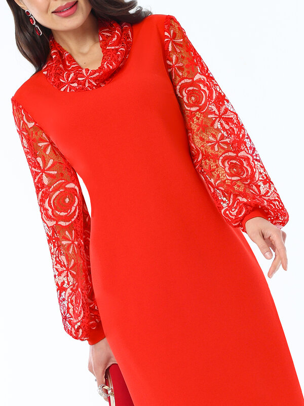 Классический полуприлегающий силуэт с минимумом швов — всегда выигрышная тема. Но в этот раз футляр декорирован кружевным воротником-хомутом и кружевными рукавами, что придает образу нарядность.