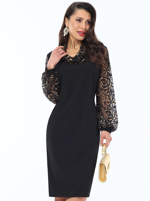 Классический полуприлегающий силуэт с минимумом швов — всегда выигрышная тема. Но в этот раз футляр декорирован кружевным воротником-хомутом и кружевными рукавами, что придает образу нарядность.