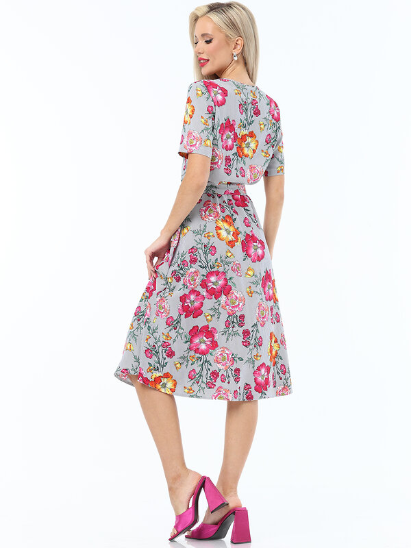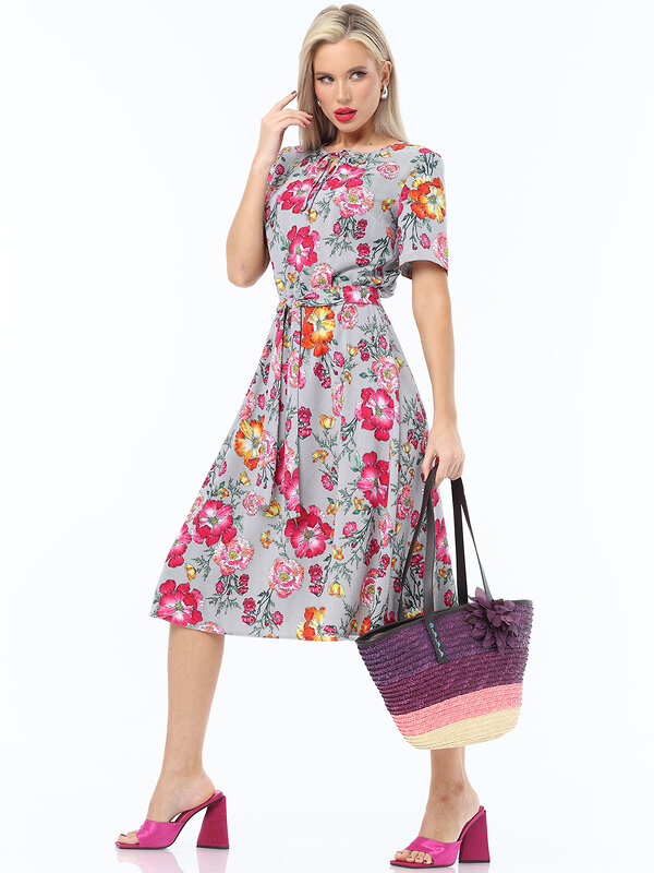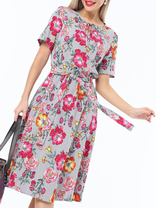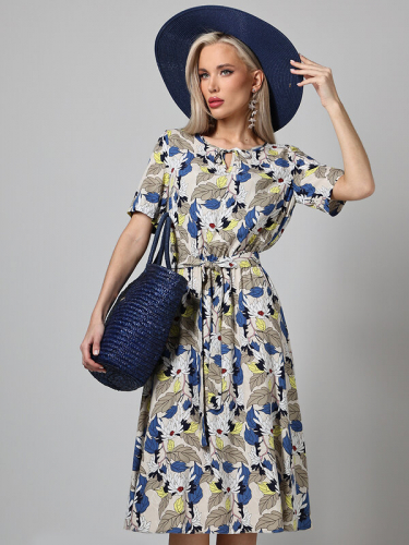 Легкое летнее платье с расклешенной юбкой и коротким рукавом. Горловина оформлена тонким кантом, переходящим в завязку-шнурок над вырезом-капелькой. Талия отрезная на резинке, но для удобства и красоты к платью прилагается пояс из той же ткани.