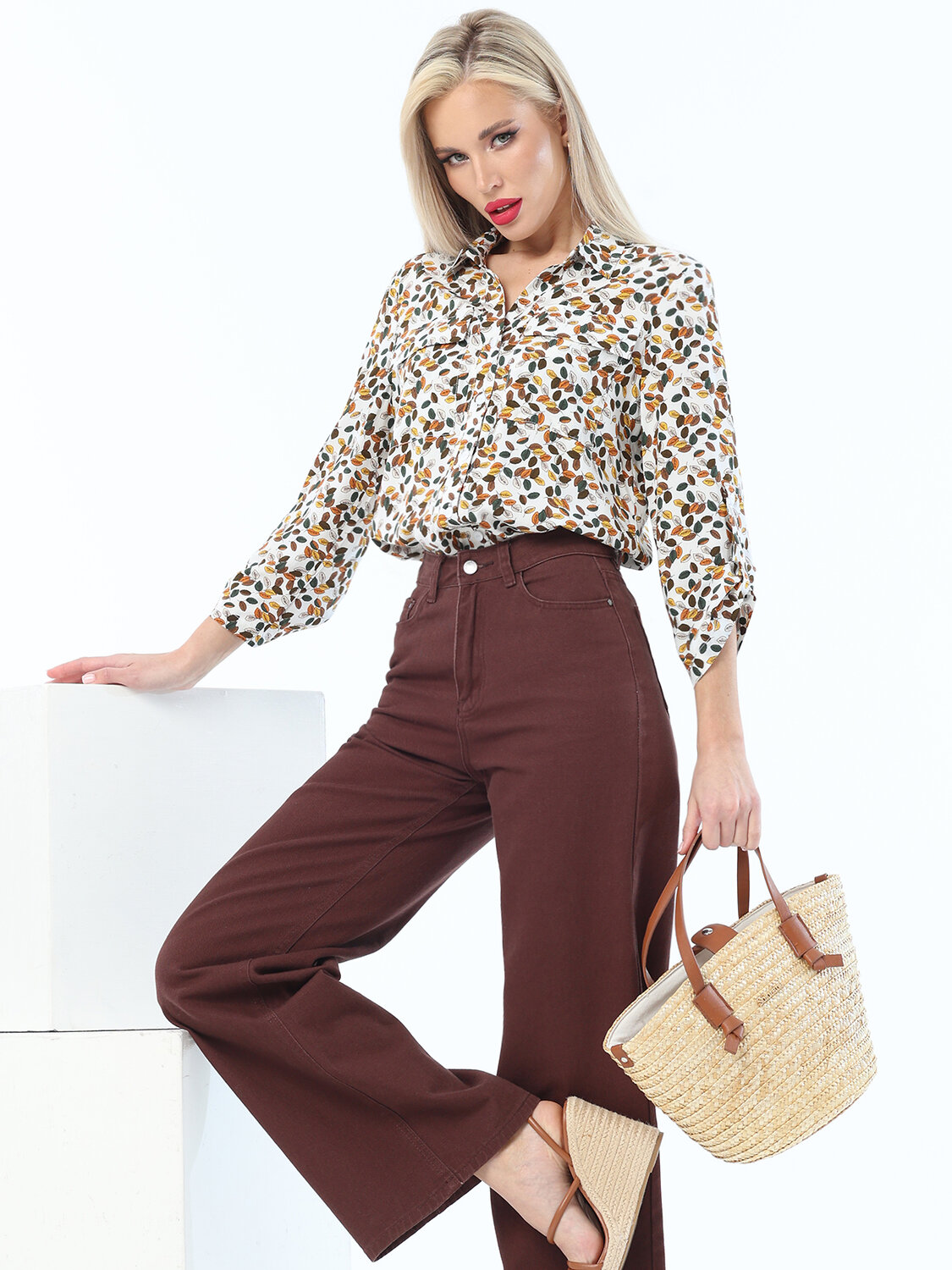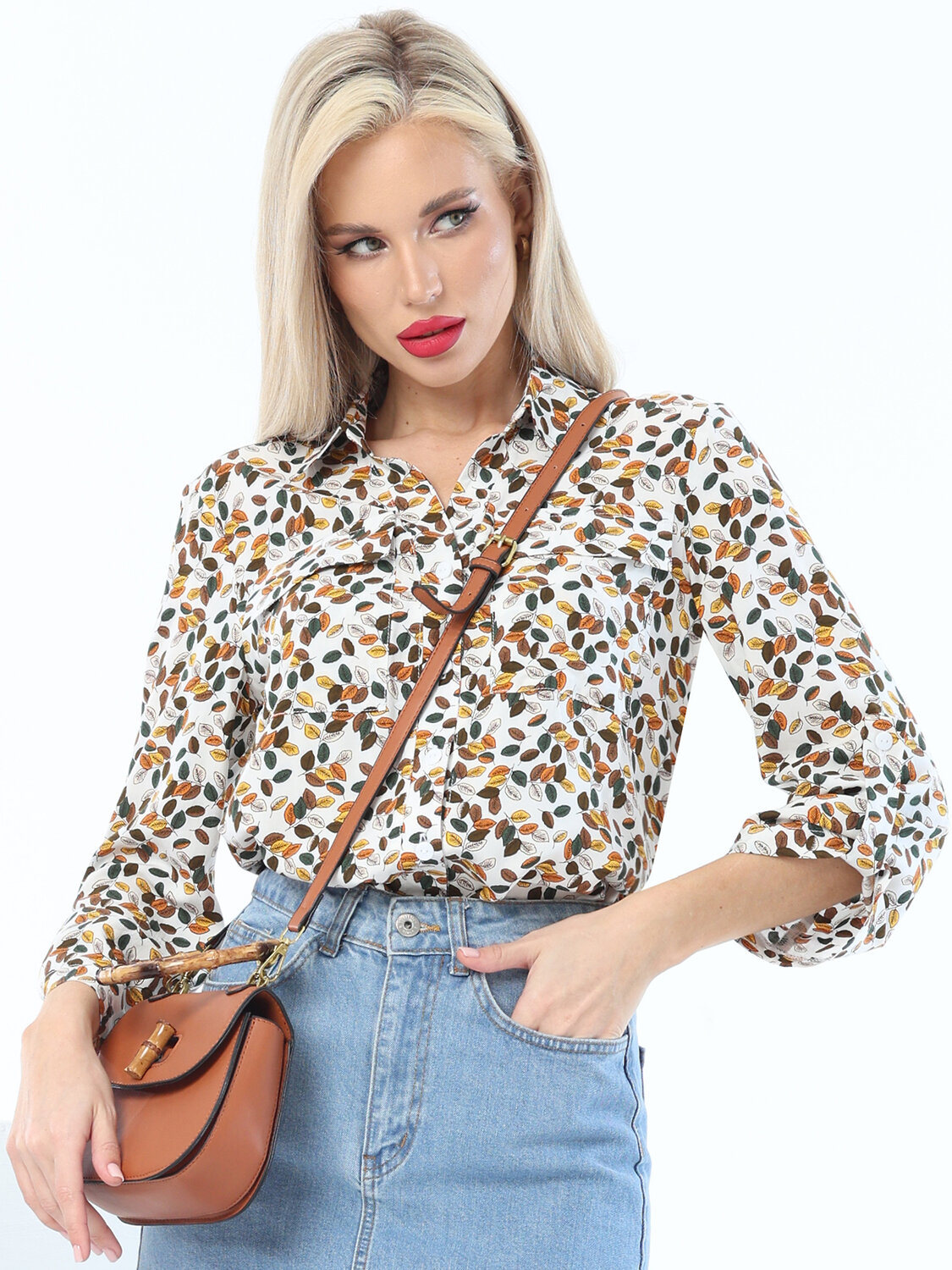 Базовая блузка на пуговицах с карманами — основа гардероба, благодаря которой можно составить стильные и элегантные образы на все случаи жизни. Свободный прямой силуэт со слегка удлиненной спинкой и разрезами по бокам не подчеркивает нюансы фигуры и позволяет чувствовать себя комфортно. Особый шарм и утонченность придают блузке рукава ¾, собранные патами. Два нагрудных кармана функциональны и добавляют образу расслабленные нотки. Стильную блузку можно носить как навыпуск, так и заправленной полностью или только спереди, чтобы создать акцент на талии и визуально удлинить ноги. А сочетать модель с другими элементами гардероба не составит труда. Универсальная блузка прекрасно смотрится в паре с джинсами, брюками и юбками различных фасонов. Рекомендуется стирать изделие в бережном режиме без отжима.