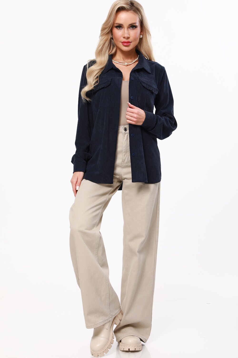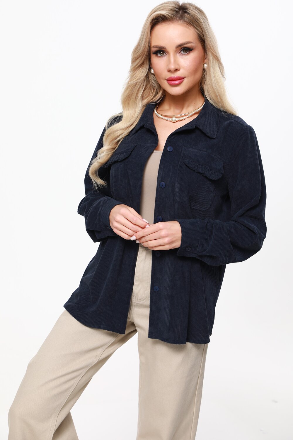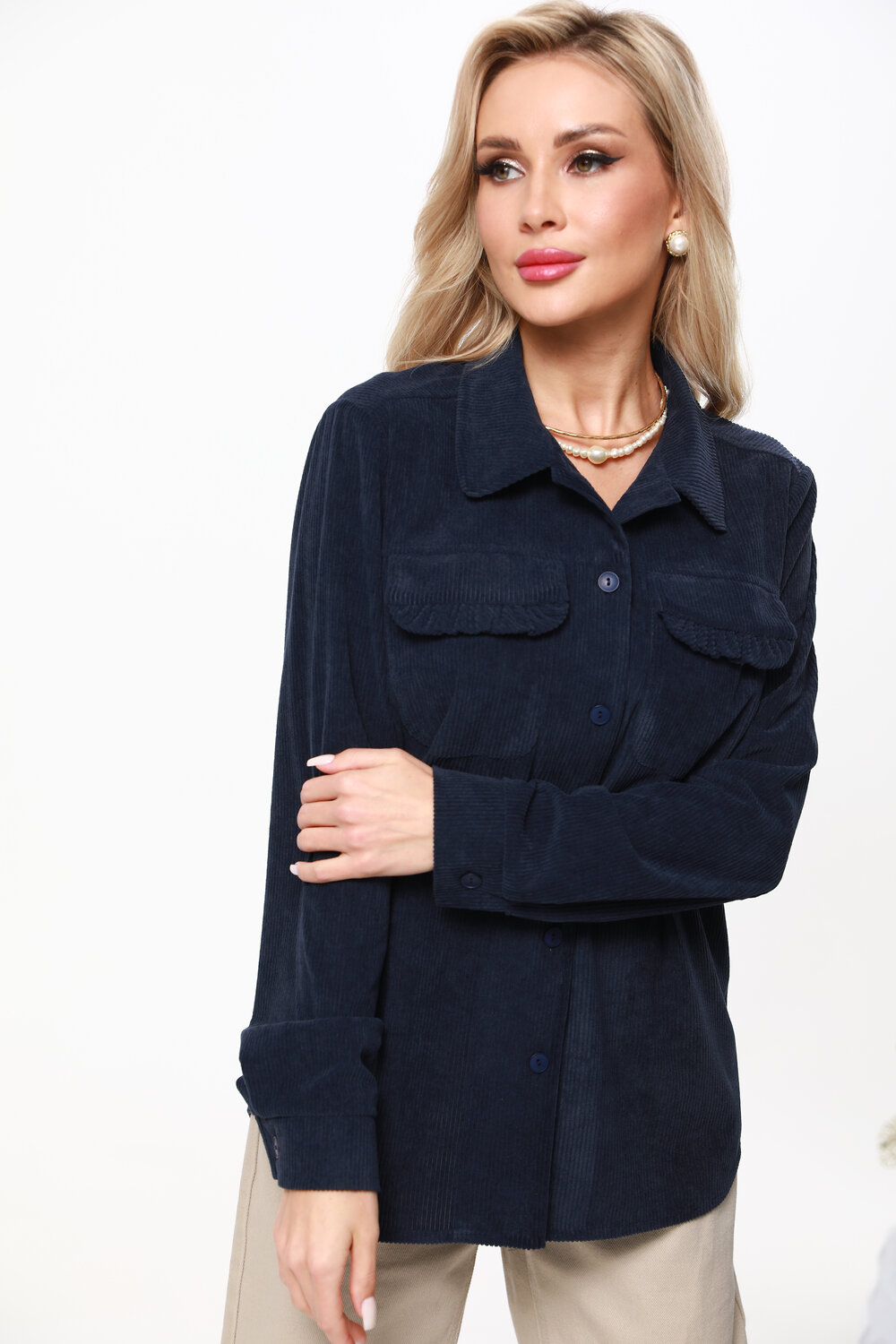 Вельветовая рубашка с акцентными карманами — универсальная вещь, которая поможет создать множество модных образов как на каждый день, так и в офис. Отложной воротничок, лаконичные пуговицы в тон, длинные рукава с манжетами и стандартная длина приближают модель к классической, элегантной сорочке, что позволяет без труда вписать ее в гардероб. Отличительная черта рубашки это не только приятный на ощупь микровельвет, но и накладные карманы, которые украшены рюшами. Эта изюминка придает изделию женственные, игривые нотки и делает ее более нарядной. Теплую, удобную рубашку можно носить как в качестве самостоятельного элемента гардероба, так и в виде верхнего слоя — наподобие куртки или жакета. В обоих случаях модель из вельвета будет выглядеть дорого и стильно. Качественный, плотный и мягкий материал хорошо сохраняет тело и дарит ощущение уюта. Рекомендуем стирать в деликатном режиме.