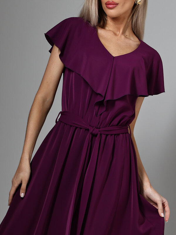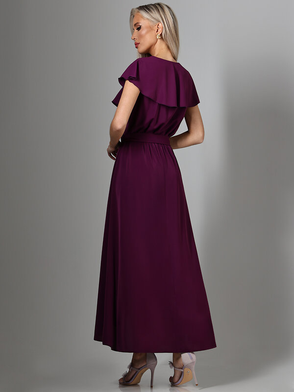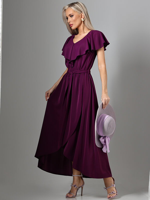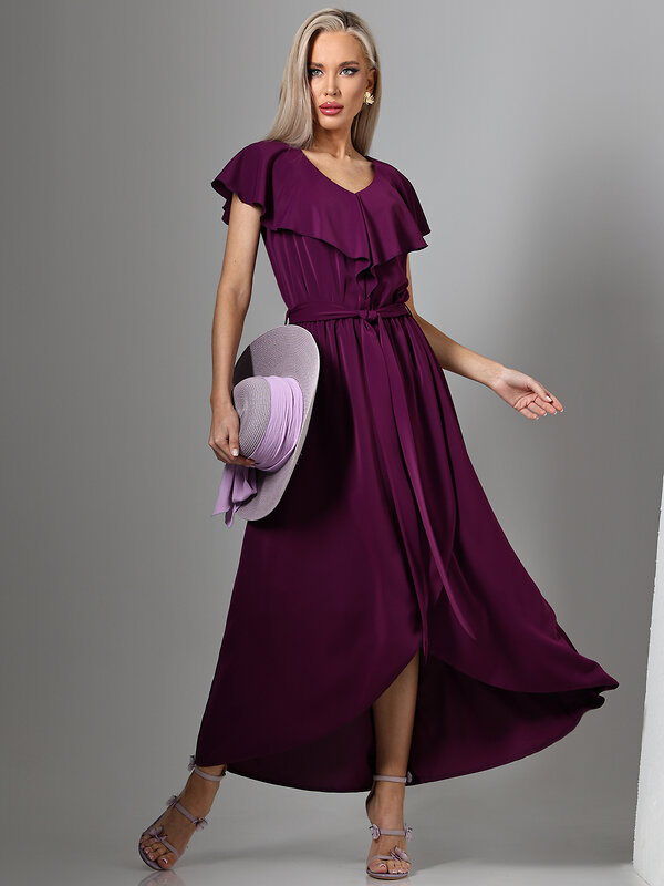 Романтичное длинное платье сливового цвета с V-образным вырезом горловины создает элегантный женственный силуэт. Модель дополнена акцентным воланом на груди, подчеркивающим линию декольте, и поясом, который можно завязать для акцента на талии. Запах на юбке обеспечивает свободу движения и добавляет динамики силуэту. Представлено в больших размерах для комфортной посадки на разные типы фигур. V-образный вырез подчеркивает женственность, а мягкие драпировки создают романтичный образ. Длинный крой платья визуально вытягивает силуэт, делая его более стройным. Сливовый цвет придает образу благородство и универсальность, позволяя использовать платье как для повседневной носки, так и для вечерних выходов или торжественных мероприятий. Уход за изделием требует бережной стирки при температуре 30 градусов, что сохраняет форму и цвет ткани.