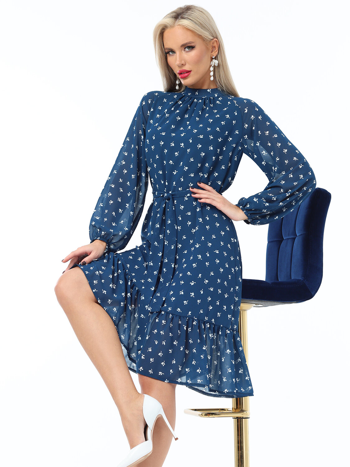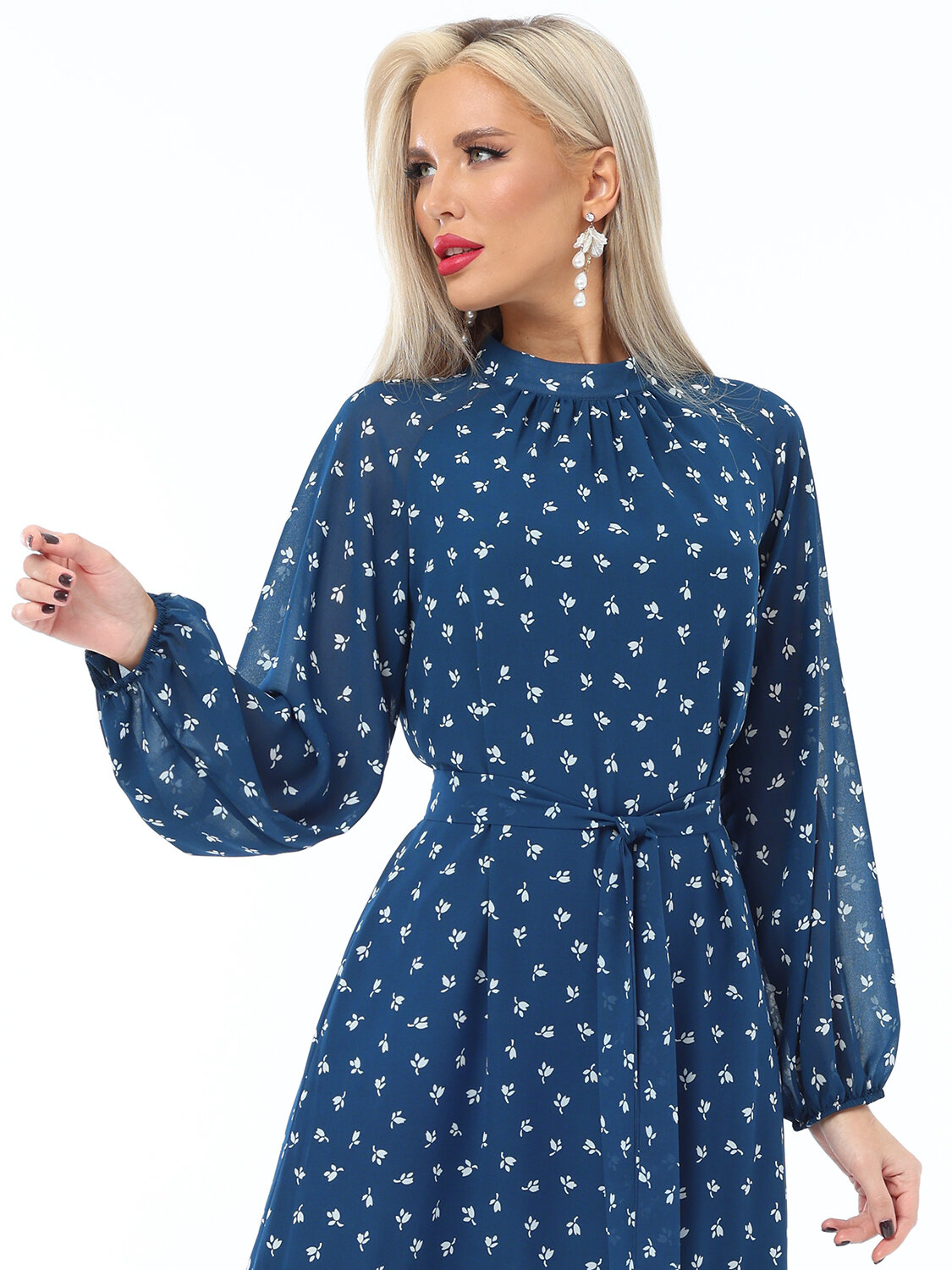 Богемное платье с рукавом реглан и воротничком-стойкой выполнено из шифона с подкладом. За счет свободного силуэта с поясом и воланом по низу юбки платье получает мягкие свободные формы, что выглядит очень романтично. Рукава присобраны на тоненький манжет. Застежка платья на пуговицах. Абсолютно самодостаточная вещь, и в пир, и в мир.