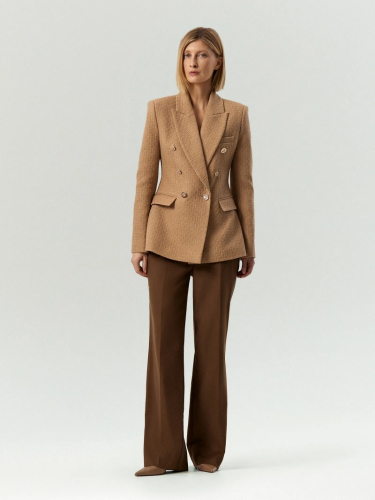 Стильный бежевый жакет сделан из плотного твида с красивым плетением и интересным рельфом. Материал не только статусно смотрится, но и радует практичностью. Он устойчив к зацепкам, дышит и комфортно ощущается на теле. В составе три четверти натурального хлопка, вискоза и немного эластана для комфортной посадки. Удлинённый и приталенный силуэт создаёт впечатление подтянутости, собранности в образе. Скруглённые широкие лацканы и нарядные пуговицы этого двубортного жакета придают нотку торжественности деловым будням. Вещь отлично сочетается с базовым низом разных фактур и цветов, станет удачной основой образов на работу и к особым случаям