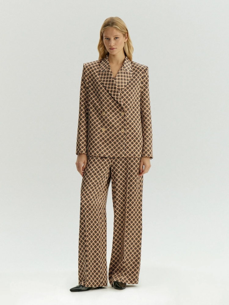 Жакет с принтом "калейдоскоп" и красивым сочетанием золотисто-бежевого с кофейным отлично подойдёт для образов к особому случаю или планов на выходные. Удлинённая модель с широкими лацканами и крупными пуговицами смотрится в меру нарядно. Гладкая вискоза приятно холодит в жару и очень приятно ощущается. Жакет выполнен на подкладке с вискозой. Завершить эффектный образ можно брюками из комплекта или базовым денимом
