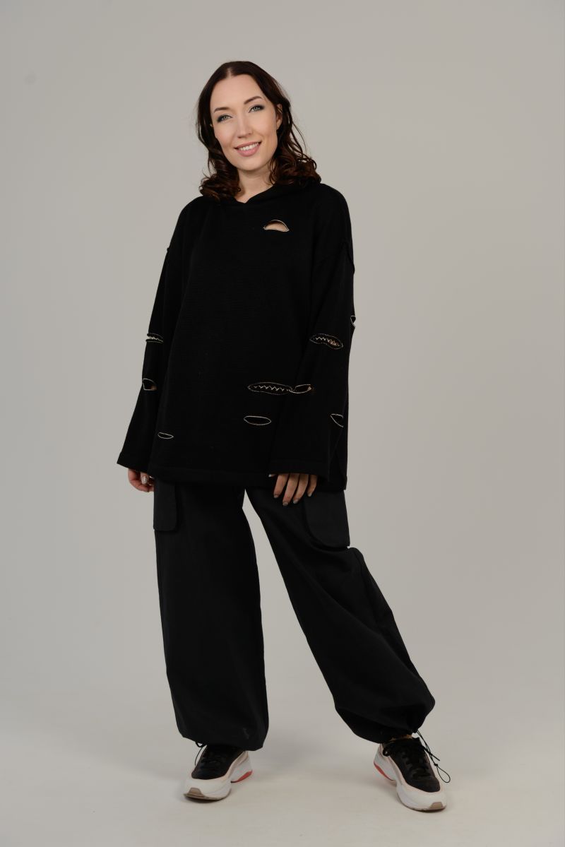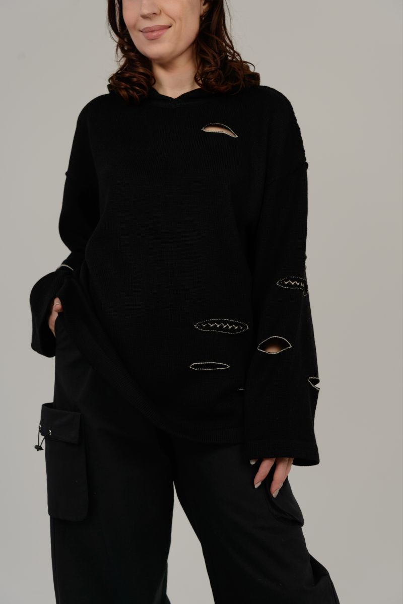 Описание: Джемпер с капюшоном, декоративная отделка "дыры", швы наружные крючком, трикотаж.