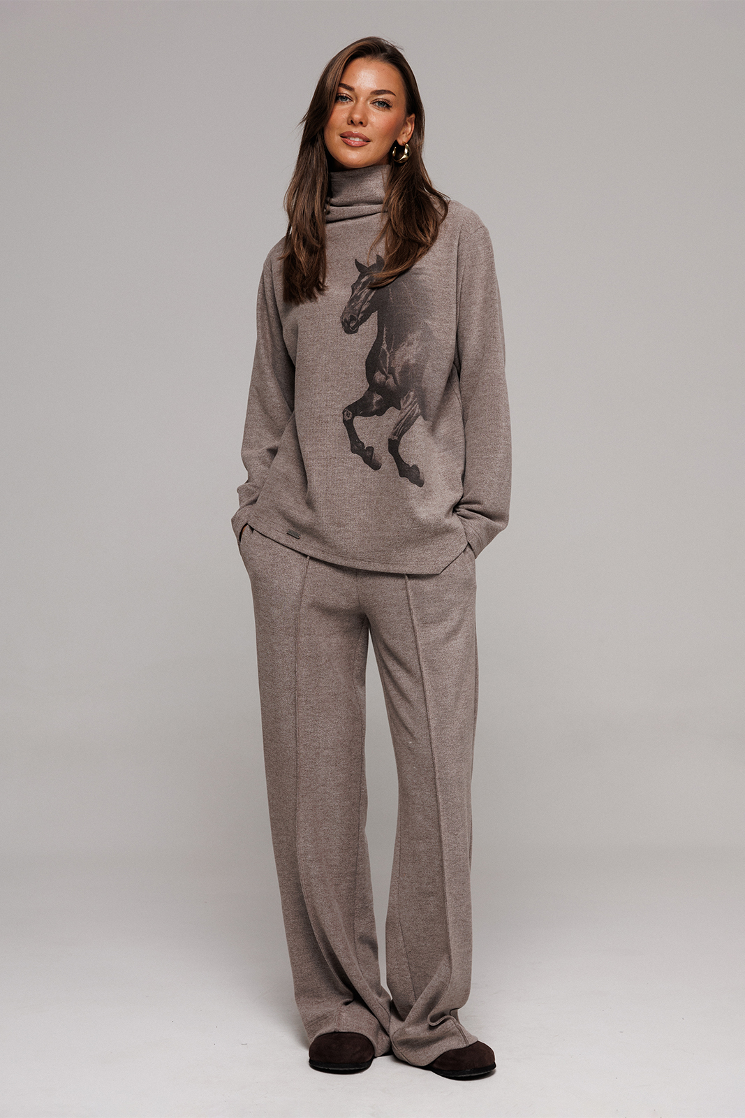 Джемпер из трикотажного полотна с велюровым эффектом прямого силуэта со спущенной линией плеча. Рукав втачной. По переду печать "Лошадь" и нашивка с гравировкой "BUTER". Низ джемпера по переду фигурный ассиметричный. Внизу по правому боковому шву обработан разрез. Воротник-стойка цельнокроеный. 60% вискоза, 35% ПЭ, 5% спандекс
