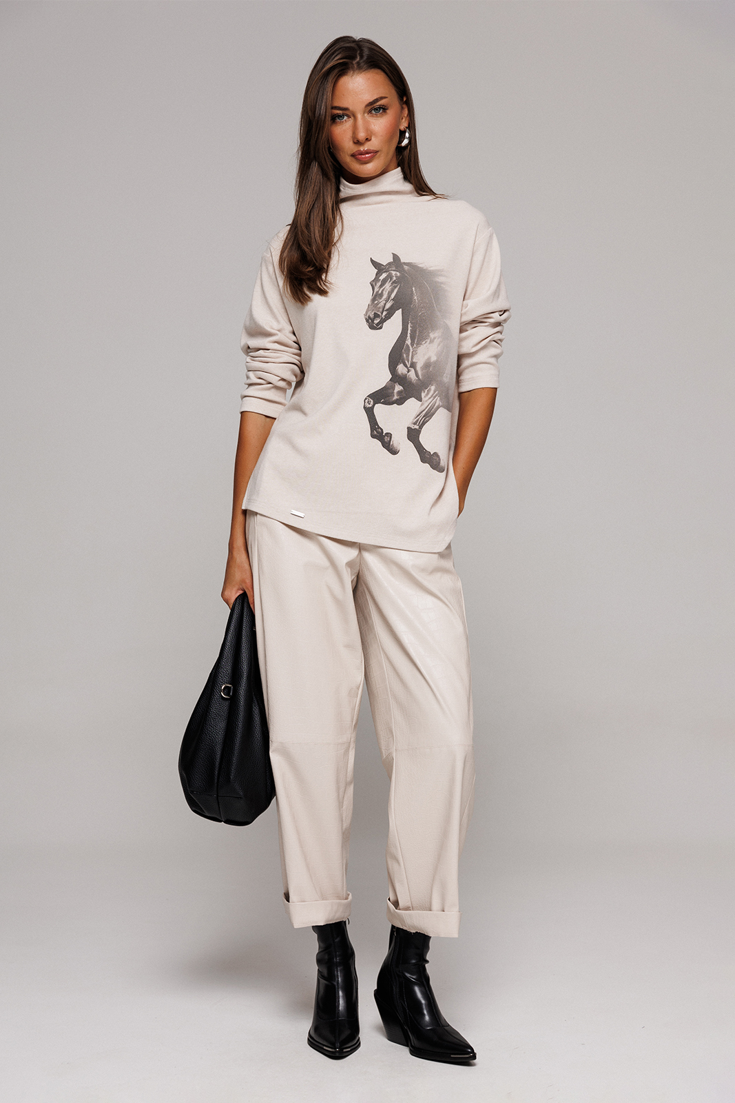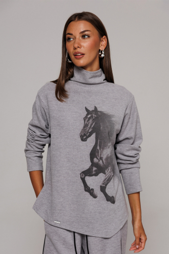 Джемпер из трикотажного полотна с велюровым эффектом прямого силуэта со спущенной линией плеча. Рукав втачной. По переду печать "Лошадь" и нашивка с гравировкой "BUTER". Низ джемпера по переду фигурный ассиметричный. Внизу по правому боковому шву обработан разрез. Воротник-стойка цельнокроеный. 47% вискоза, 27% ПЭ, 20% ПА 6% спандекс