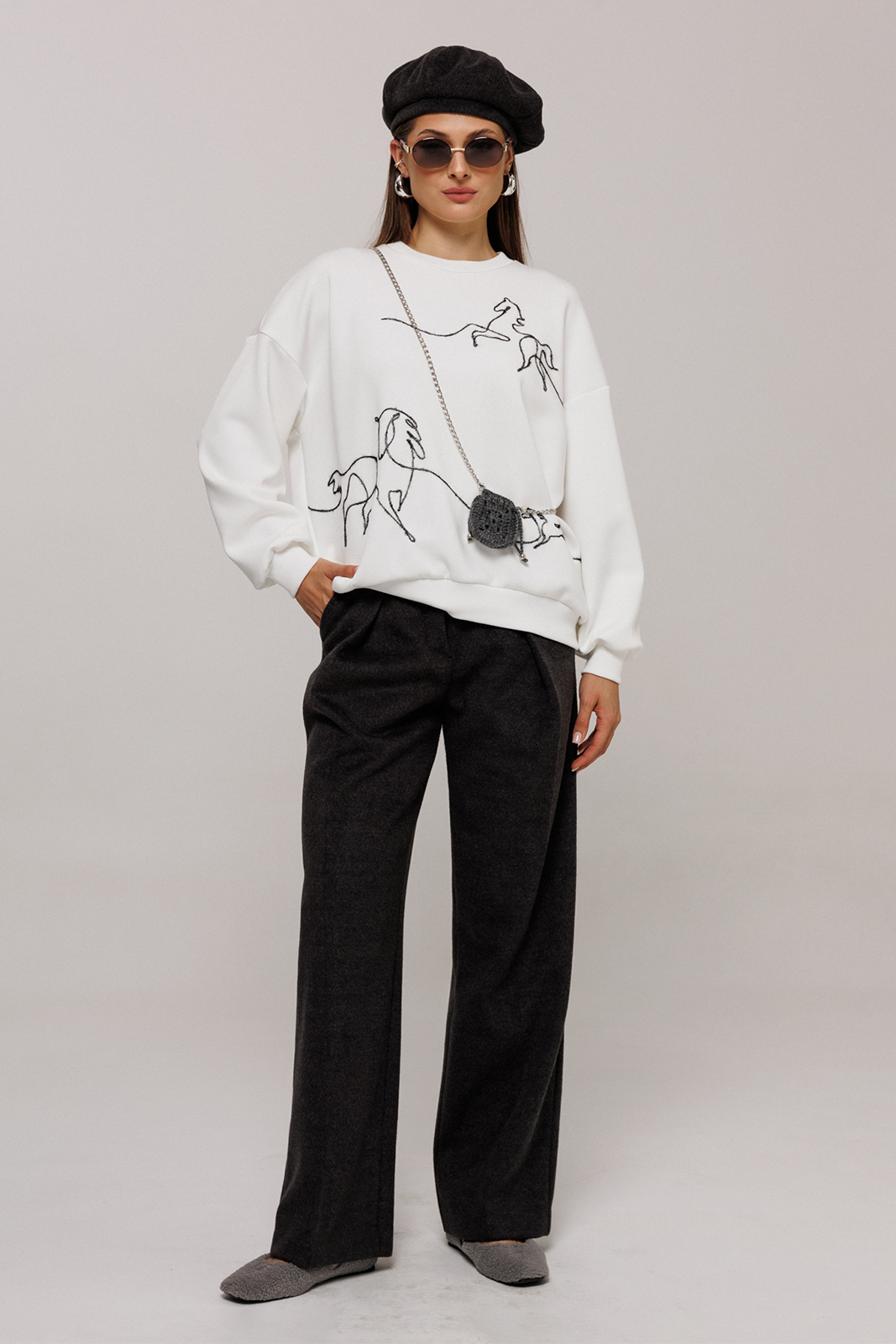 Джемпер из технологичного трикотажного полотна с эффектом peach. Прямого силуэта с втачным рукавом и спущенной линией плеча, с манжетой из отделочной ткани по низу рукава. По переду вышивка декоративным шнуром "Кони". По горловине и низу изделия притачная планка из отделочной ткани. 54% ПЭ, 40% вискоза, 6% спандэкс